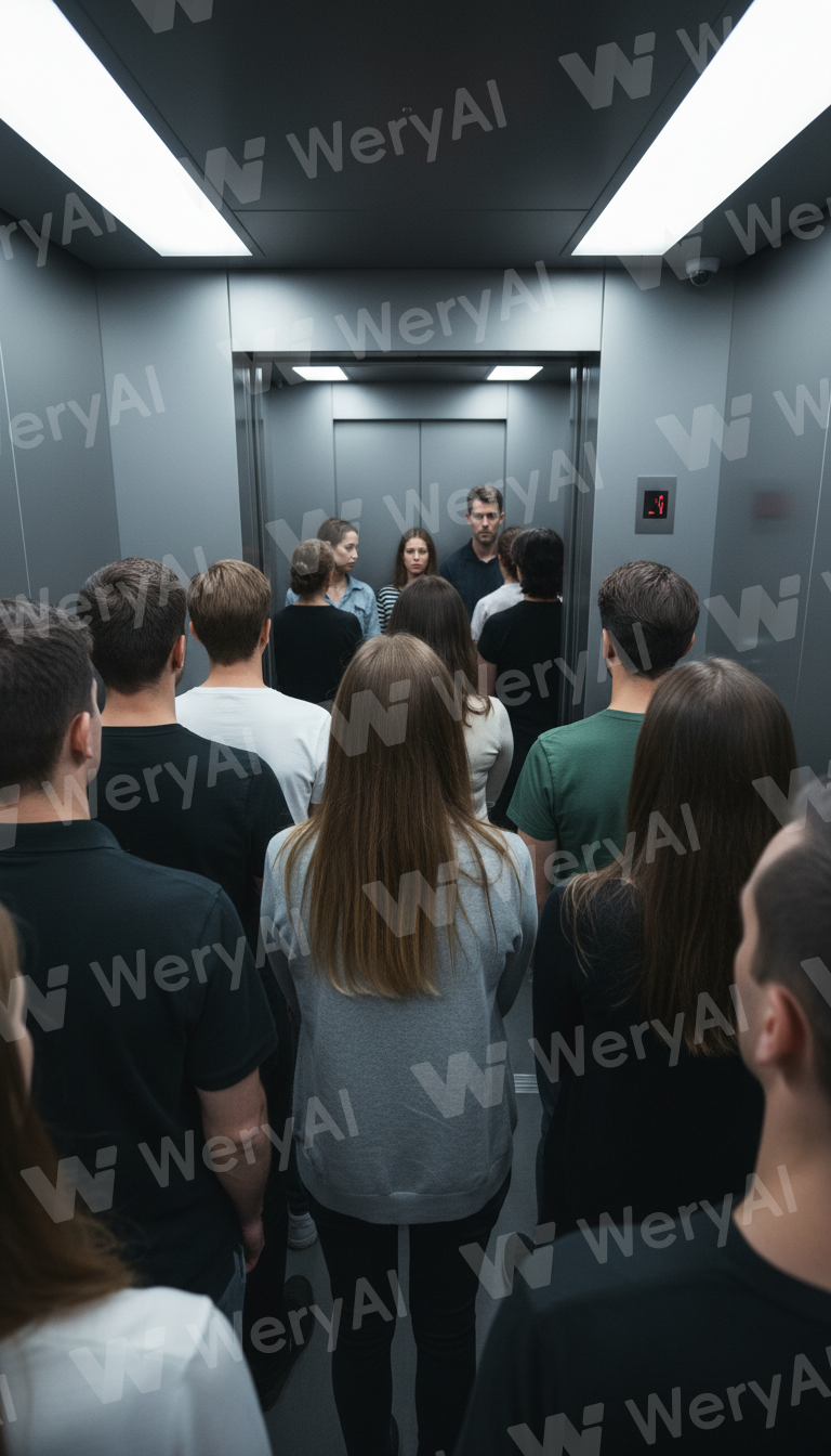 First-person perspective (POV) from the very back of an elevator. Several passengers are standing in a row in front of you. People are arranged in a line or semi-circle facing the elevator entrance. The passengers are mixed gender, with varying ages and styles of clothing. Everyone is silent, facing the same direction (the elevator doors/exit). Not a single person turns around, and there is no eye contact at all. Expressions range from blank to slightly stiff, with an indefinable sense of unease and quiet tension. The elevator interior is modern and clean. Metal walls and the control panel are slightly visible at the edges of the field of view. Fluorescent lights on the ceiling emit a uniform, cold light, emphasizing the claustrophobic pressure of the enclosed space. The composition is slightly wide-angle, emphasizing depth. Not horror, but a surreal atmosphere capturing an abnormality hidden within everyday life. Realistic, cinematic, high resolution, for social media.