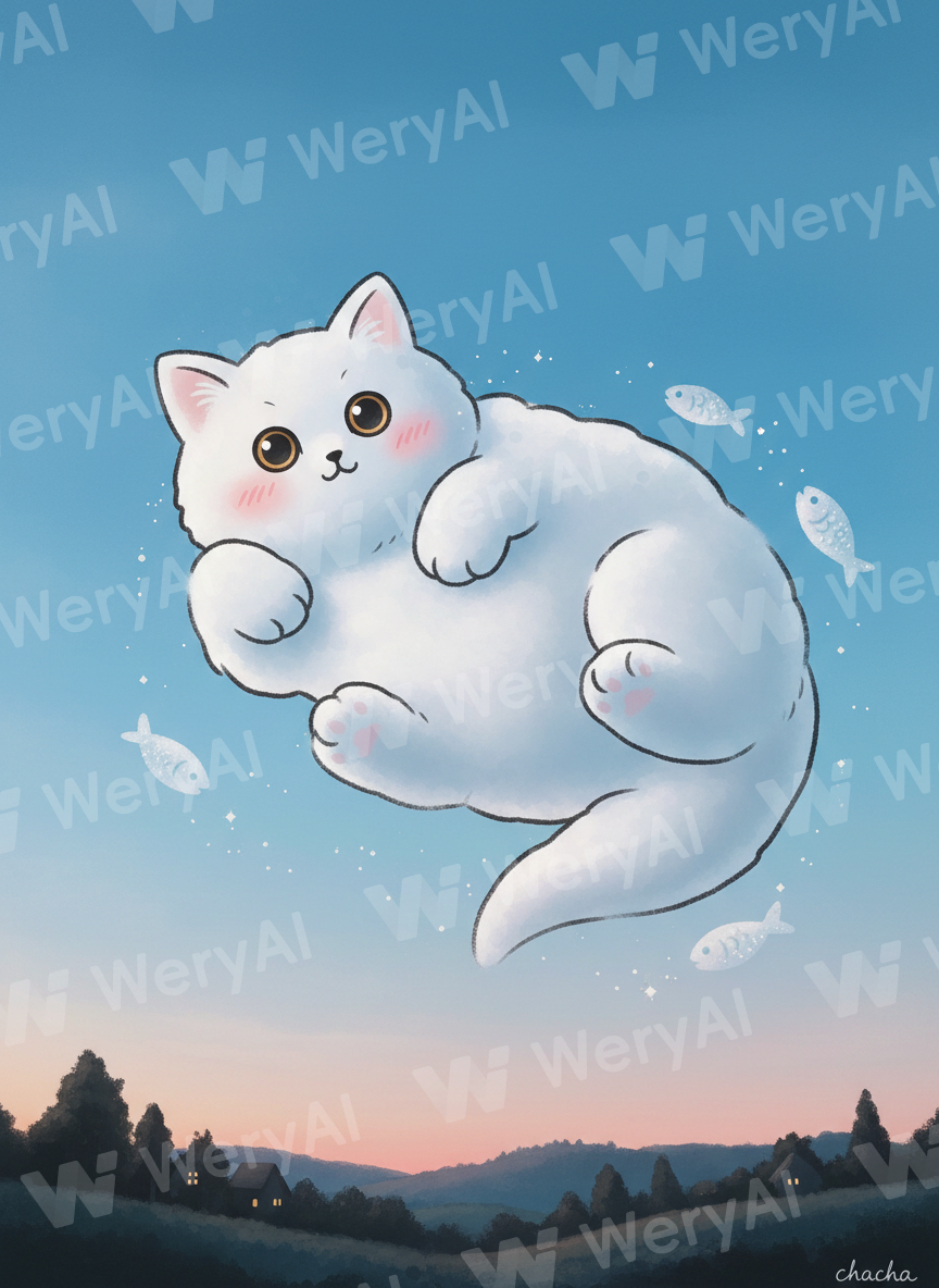 Transform the clouds into the shape of a lazy cat. The cat is formed from white, gradient clouds, with cute eyes and cheeks tinged with a light pink blush. Its outline is drawn with black lines, and fish elements are scattered around it. The background is a blue sky with trees and house silhouettes as accents. The overall image is dreamy yet warm, in a realistic style, with a small handwritten signature "chacha" in the bottom right corner.