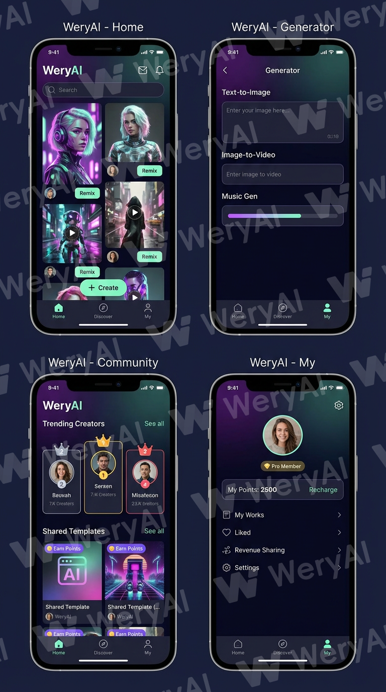 Please design the UI style for an app named WeryAI, which is an AI creator community product focusing on text-to-image/video, image-to-image/video, music generation, and image/video editing tools. Please customize a color scheme for the product based on the preferences of this user demographic. The app has three tabs; the third tab is called 'Profile' (or 'Me'), which includes Top-up, My Works, My Favorites, etc. In terms of the overall product structure, consider adding a revenue-sharing logic: users can distribute the videos they create within the community; if other users create videos using the same style/template, the original creator can enjoy a certain percentage of credit rewards or revenue sharing. The more people create using it, the more the original creator earns.