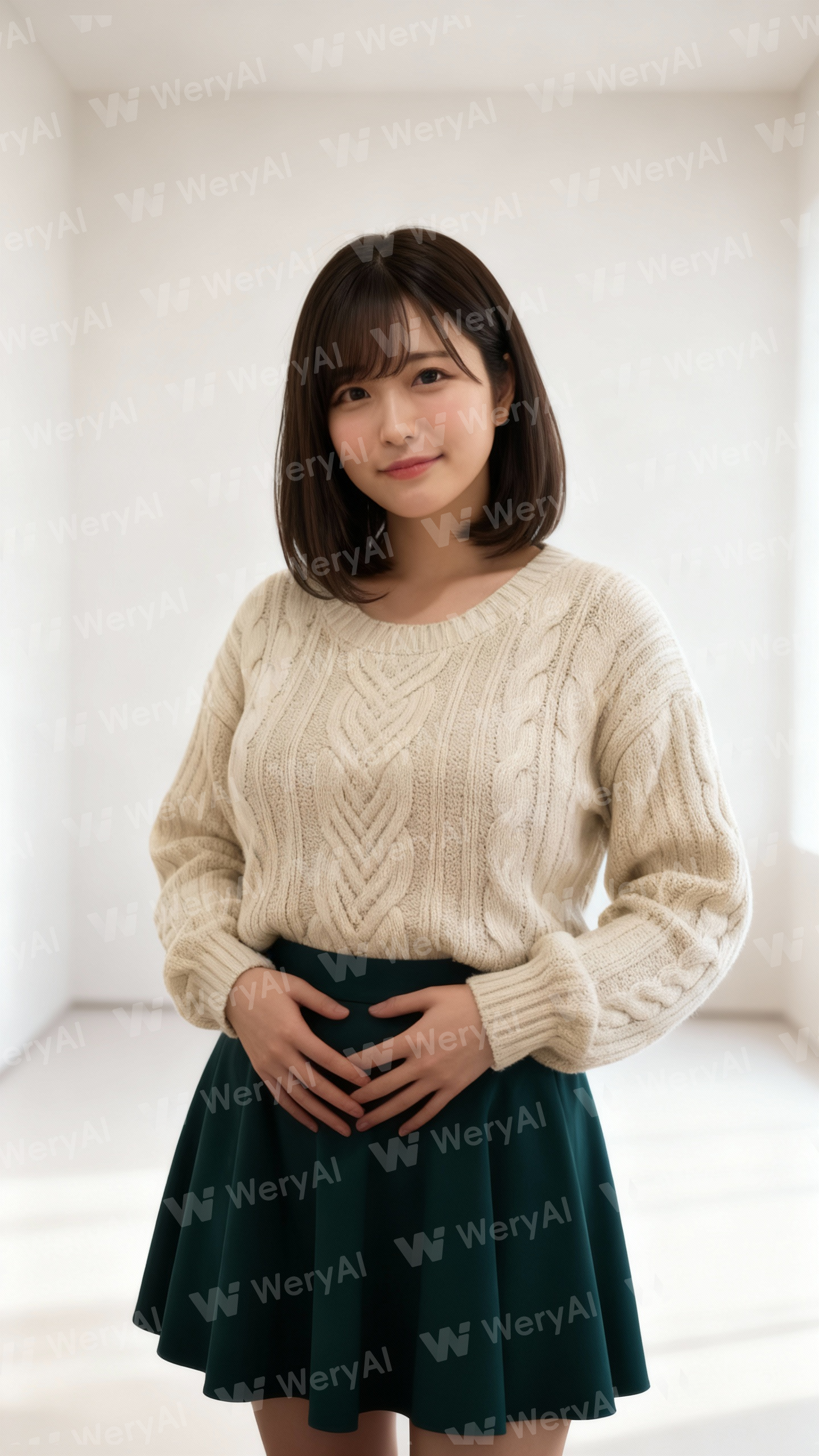 [Hair] Keep the hairstyle and hair color from the character; do not change style, length, or color. [Clothes] Preserve the character's clothes. [Pose & Hands] Slightly angled 3/4 view facing the camera in a relaxed full-body pose. Both hands rest gently on the character's lower abdomen. [Camera] Fixed waist-level height, straight-on angle, framing centered on hips and waist with slight headroom. [Environment & Lighting] **Completely empty room**, Minimalist modern indoor room, off-white walls, soft daylight. Subtle shadows, Symmetrical soft lighting, shallow depth of field. Remains simple, uncluttered, blank. [Face] Perfect balanced features, flawless smooth skin, clean fine pores, refined nose and lips, natural soft expression. [Eyes & Skin] Eyes: natural dark irises, pure-black pupils, no glow. Skin: healthy, natural tone consistent with the reference image, no over-smoothing. [Quality & Style] Masterpiece, best quality, ultra-realistic, 8k UHD, photorealistic live-action.