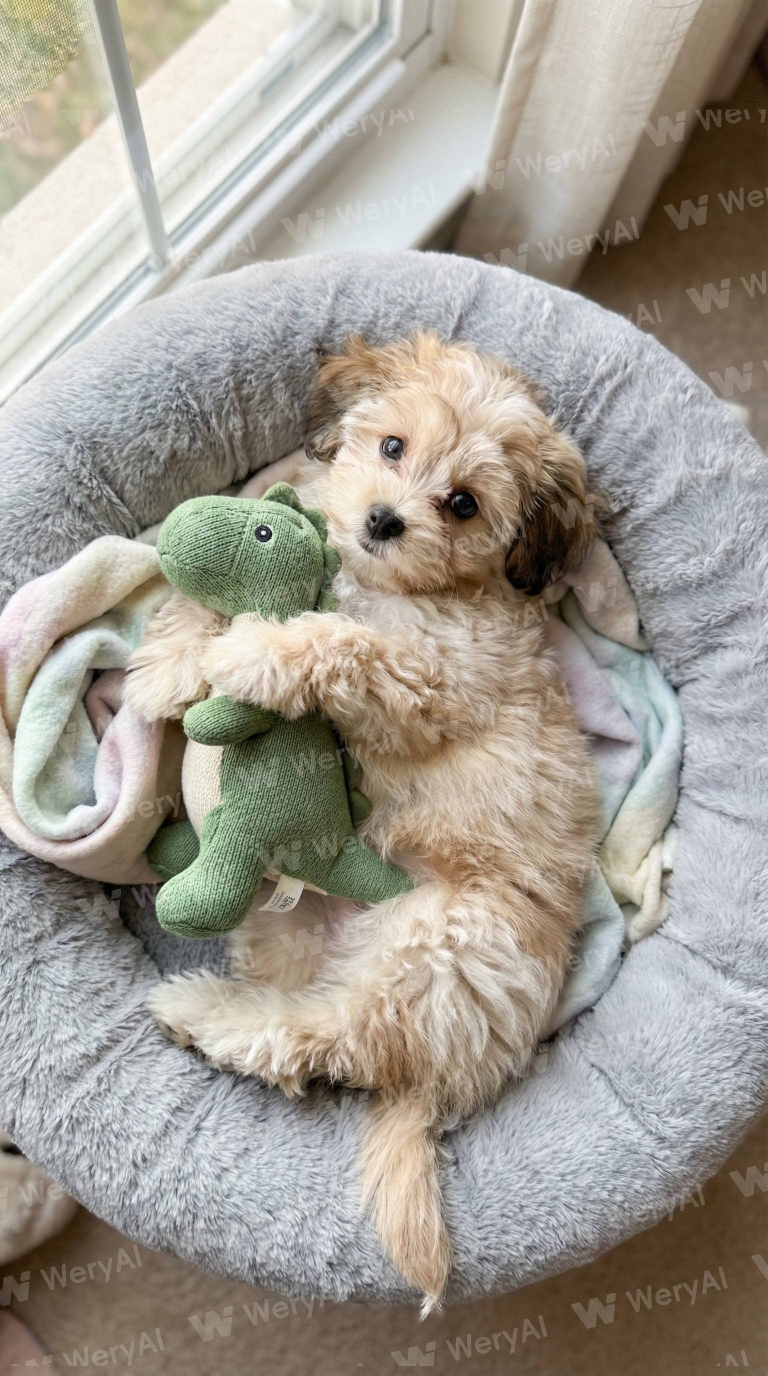 Ultra-cute small fluffy puppy lying on its back in a soft gray plush dog bed, hugging a green dinosaur stuffed toy. The puppy has round shiny eyes, a tiny black nose, soft cream-and-brown fur, and a gentle innocent expression. Cozy composition with the puppy nestled snugly in the bed, paws wrapped around the plush toy. Soft natural lighting, pastel tones, shallow depth of field, photorealistic yet kawaii style, ultra-detailed fur texture, warm and comforting atmosphere, high resolution, top-down view, heart-melting cuteness.