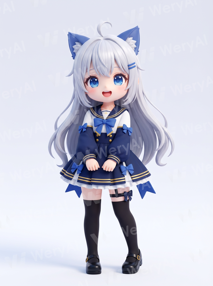 Based on reference image 1, generate the cartoon style of reference image 2, 3D cartoon style, smiling with mouth open, a cute little girl, keep the overall appearance unchanged, solid color background.