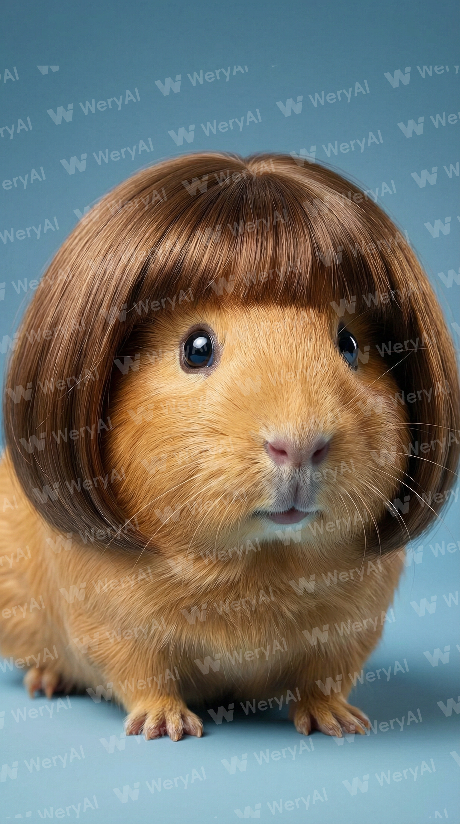 A hyper-realistic studio portrait of a guinea pig with soft golden-brown fur, facing forward, wearing a perfectly styled human bob haircut with straight bangs, glossy brown hair, symmetrical framing. The guinea pig has large shiny black eyes, a small pink nose, and a calm, slightly curious expression. Professional studio lighting, smooth blue background, ultra-sharp focus, shallow depth of field, photorealistic fur texture, whimsical and surreal concept, high detail, 8k quality.