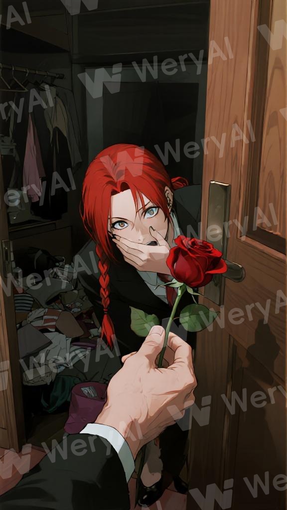 In a daily snapshot-style image, Makima from "Chainsaw Man" with red hair in a braid hides behind the wooden door of a girl's room. As she bends down, her beautiful eyes look toward the camera, and one hand covers her mouth in an expression of surprise. Viewed from a first-person perspective in a dark atmosphere, only a partial male hand appears in the frame, handing over a rose. Hentai style, the background is a room filled with feminine clutter, where details are clear yet shrouded in darkness. The overall piece presents the realistic and clear feel of Tatsuki Fujimoto's art style, with no traces of deliberate composition or lighting.