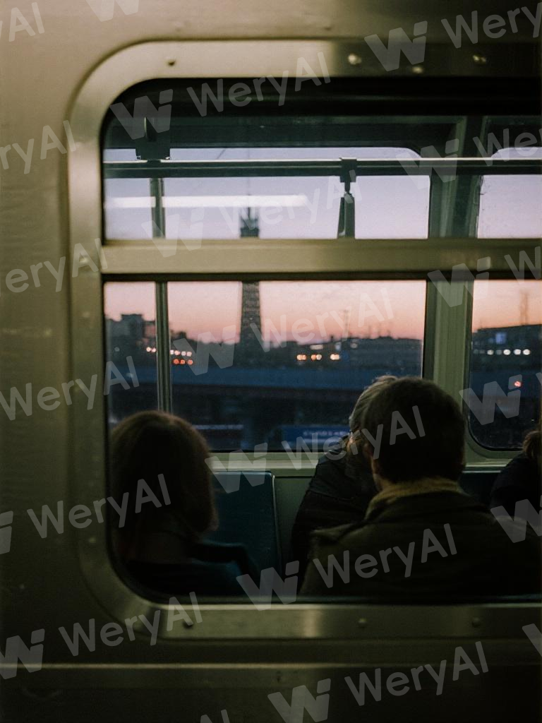 A realistic cinematic shot inside a train during evening commute. Passengers looking out the window, city lights softly blurred, moody lighting, shallow depth of field, film grain texture.