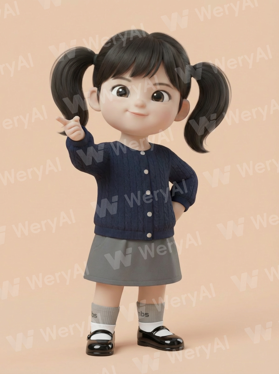 Based on reference image 1, generate in the style of reference image 2, 3D style, keep the character design consistent, a playful little girl, no outlines. Wearing Mary Jane shoes on her feet, keep the overall appearance unchanged, solid color background.