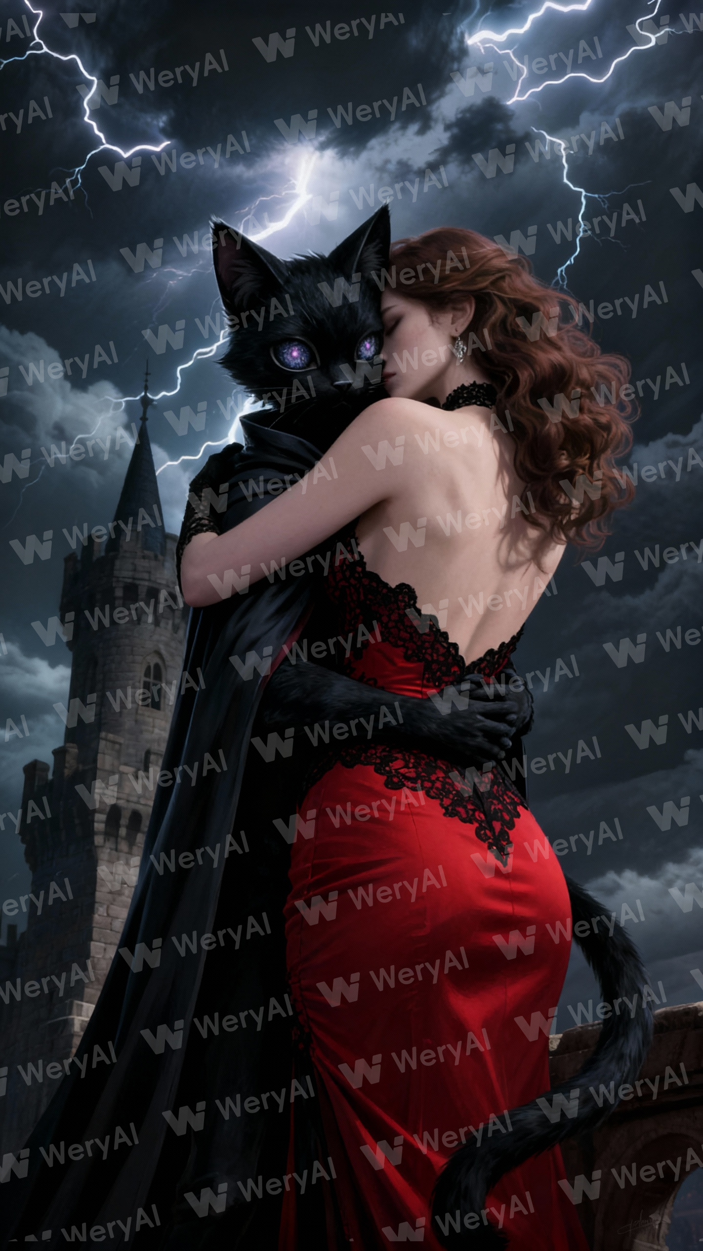 digital painting, a cat-like humanoid in a dark cloak, over-the-shoulder shot, passionate embrace, ruby dress, storm clouds, lightning, castle tower, ultra-detailed, cinematic quality, masterpiece, best quality