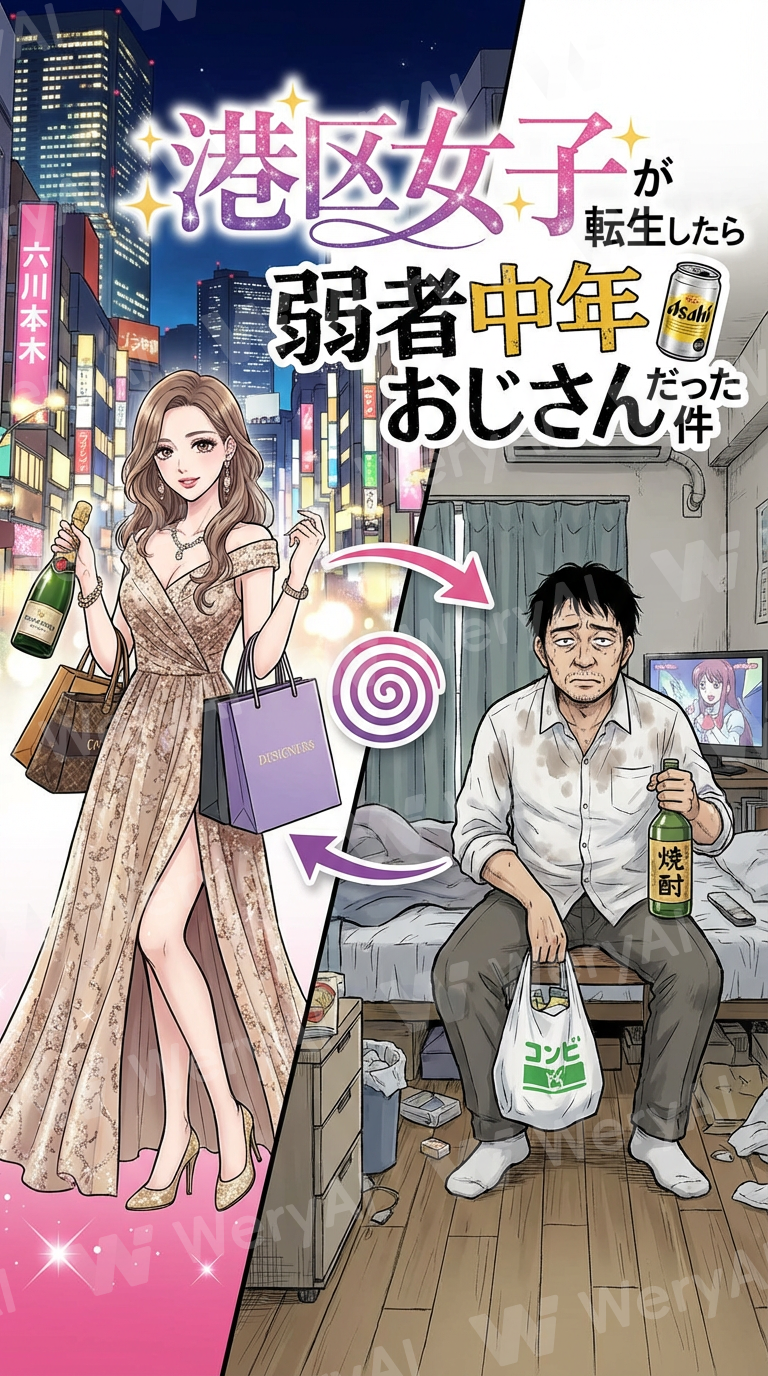 Create a manga cover about a Minato-ku girl who is reincarnated as a weak middle-aged man.