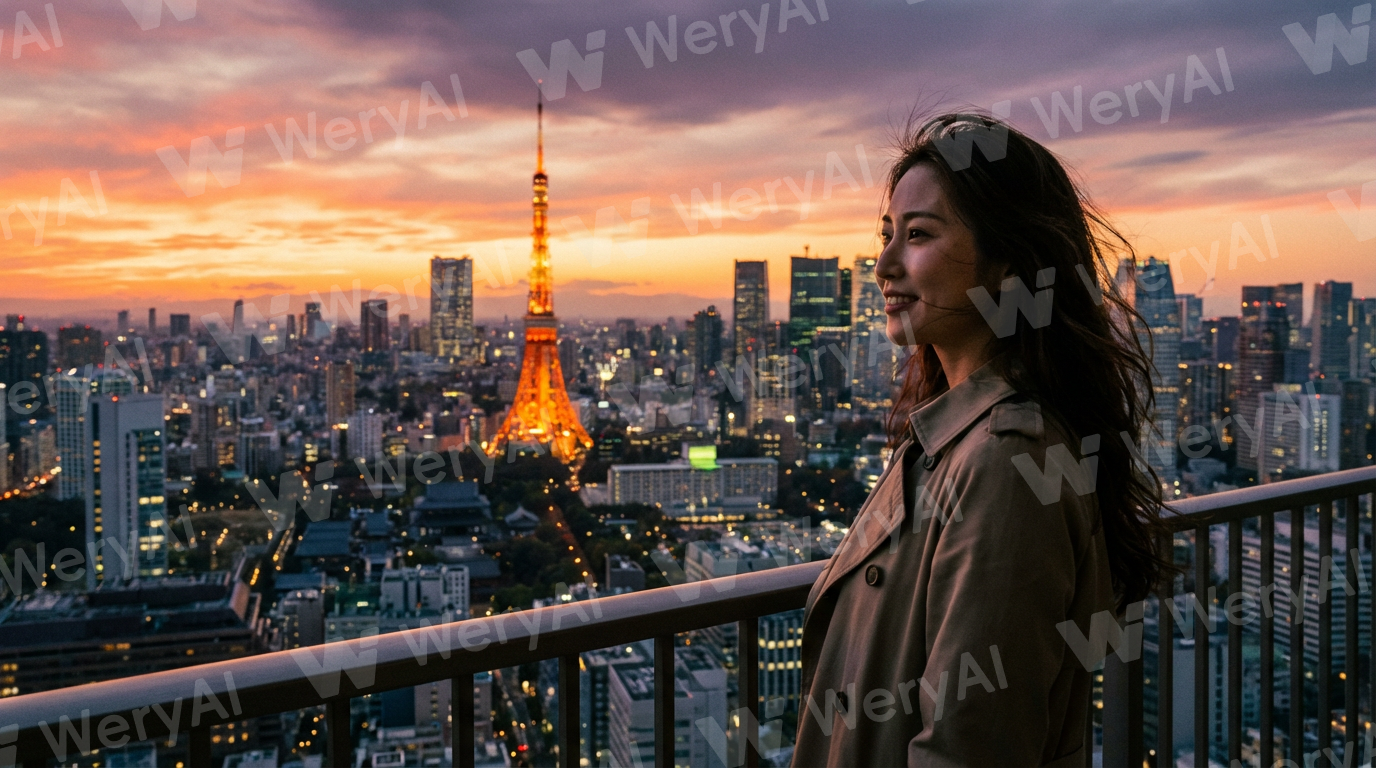 A stunning Japanese beauty standing on a balcony with the Tokyo city sunset in the background.