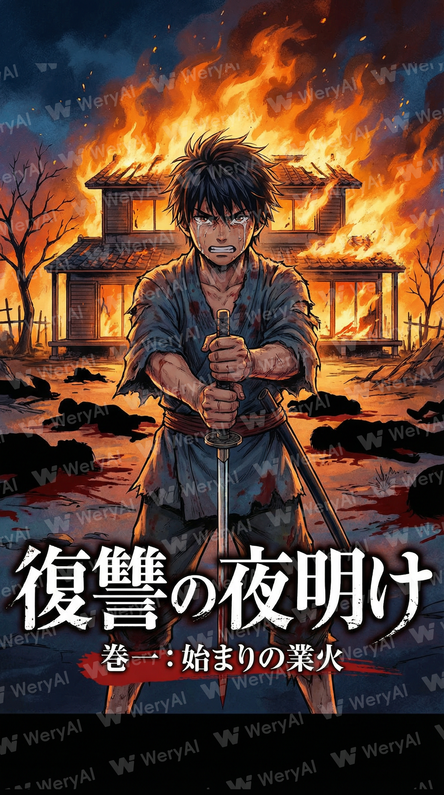 Create a manga cover for a story where a man's family is kil...