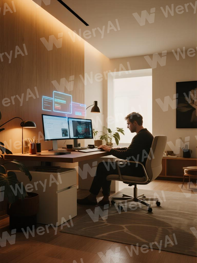 A realistic futuristic home office with holographic screens floating subtly above a desk. A person works calmly, warm indoor lighting, lived-in environment, cinematic realism.