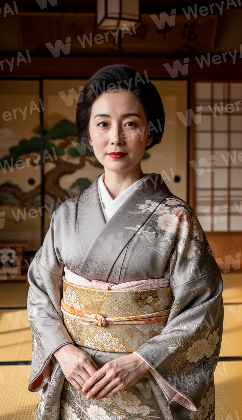 a Japanese woman, wearing a kimono, traditional Japanese background, photorealistic, ultra-detailed, cinematic lighting --ar 9:16