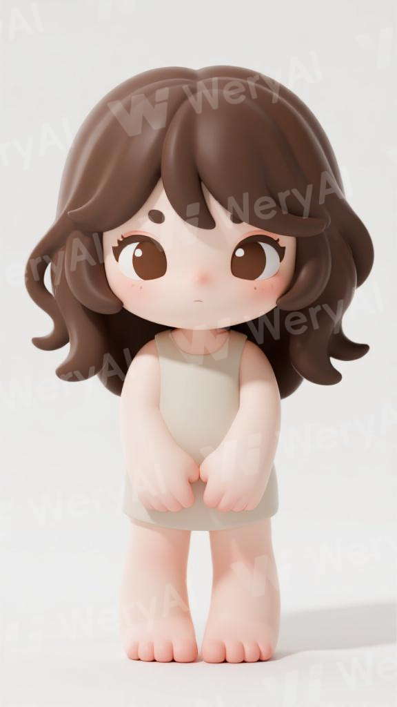 Blind box figurine, 3D, IP, cute [girl, medium-length curly hair, simple clothes, barefoot] anthropomorphic figure, Pop Mart style, cute, adorable, clean background, ultra-detailed, Blender, C4D modeling, Octane Render, 32