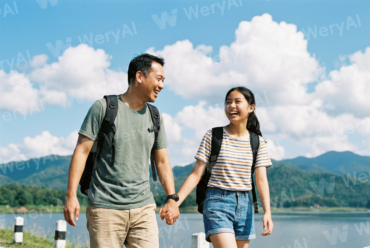 A man in his 40s and his 15-year-old daughter are traveling together, holding hands and smiling, under a blue sky with white clouds (Asian, realistic style, no text, no Chinese or English characters).