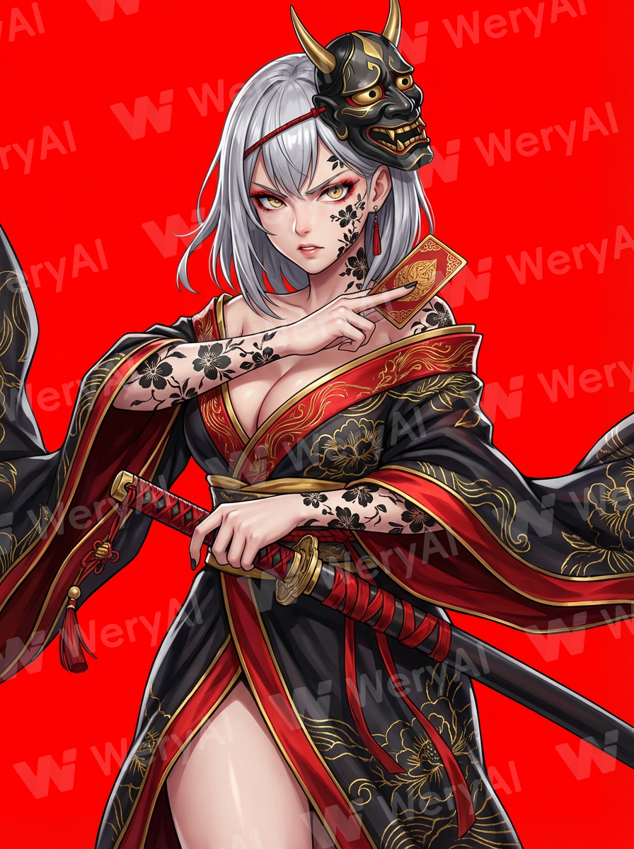 Subject: Japanese anime-style girl with silver hair and pale skin, sharp golden eyes accompanied by vermilion eyeshadow, face and forearms covered in spreading black patterns, with a resolute and high-tension expression. A hot figure with full breasts and hips on display, creating a powerful visual impact. Outfit: Black and red contrasting silk kimono, deeply textured gold thread embroidery, sharp shoulder tailoring, the material exhibiting delicate luster and fluid drapery details. Accessories: A black and gold Hannya mask worn at an angle, an exquisite katana wrapped with red ornaments on her back, holding a gold-stamped red card between her fingers, presenting an aesthetic of metal and cold weaponry. Background: High-saturation pure red seamless background, utilizing AO (Ambient Occlusion) to enhance the subject's silhouette, with a minimalist composition highlighting the visual focus. Style: Cyber-minimalist aesthetic, SSS (Subsurface Scattering) giving the skin a translucent quality, sharp rim lighting, 8K HDR, ultimate digital hand-painted quality.