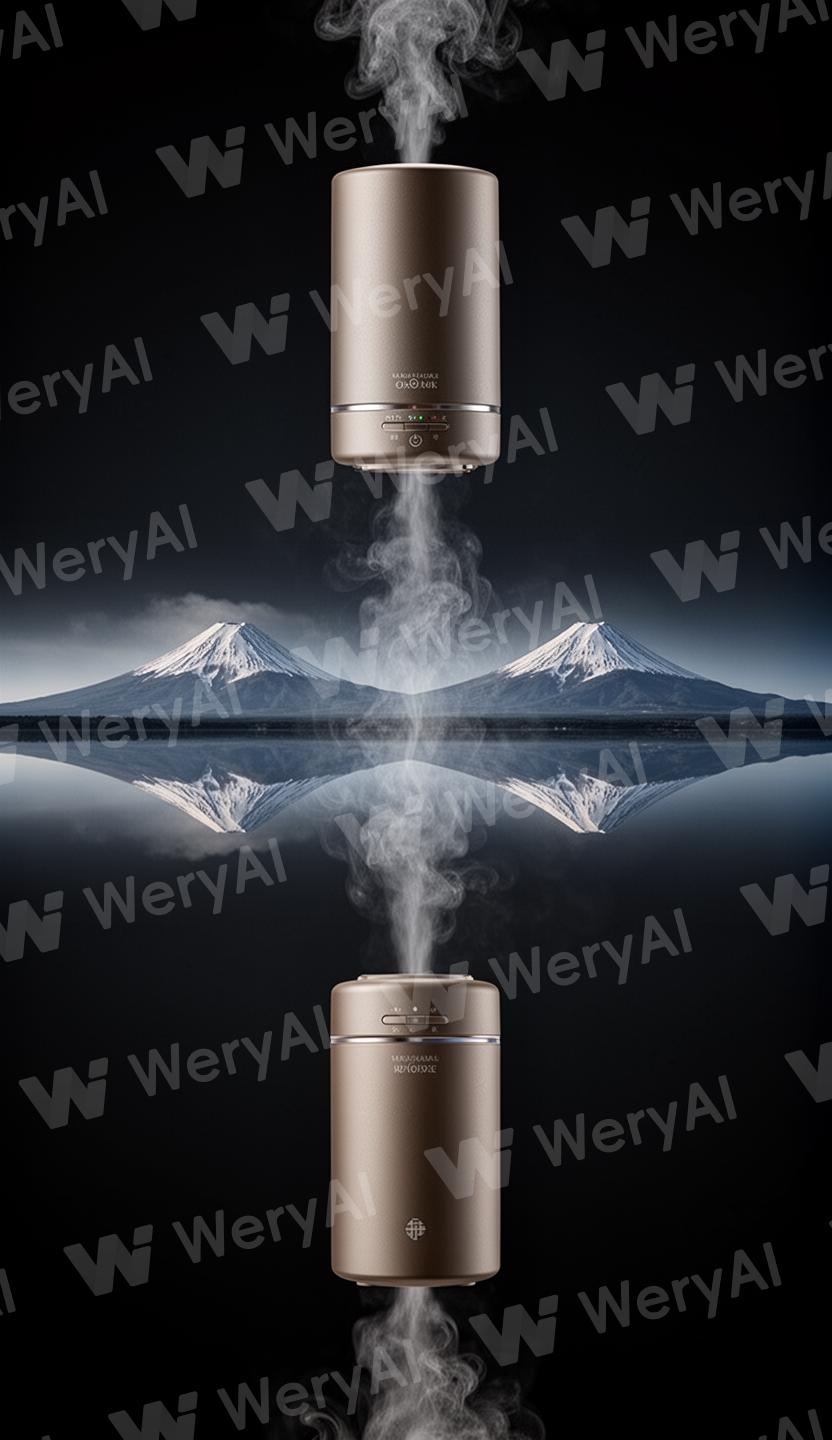A premium product concept image with a strict mirrored composition. Two identical cylindrical aroma diffuser devices placed vertically, one on top and one below, facing each other symmetrically. The top device is upright. The bottom device is inverted upside-down, mirroring the top one. They are aligned on the same central vertical axis, creating an inverted reflection effect, inspired by Mount Fuji reflection. A soft mist and light flow connects the two devices at the center, symbolizing balance and mutual complement. Dark minimal background, calm and elegant. Japanese aesthetic, restrained, luxury. No text, no logo, no people. Photorealistic, high-end commercial product photography.