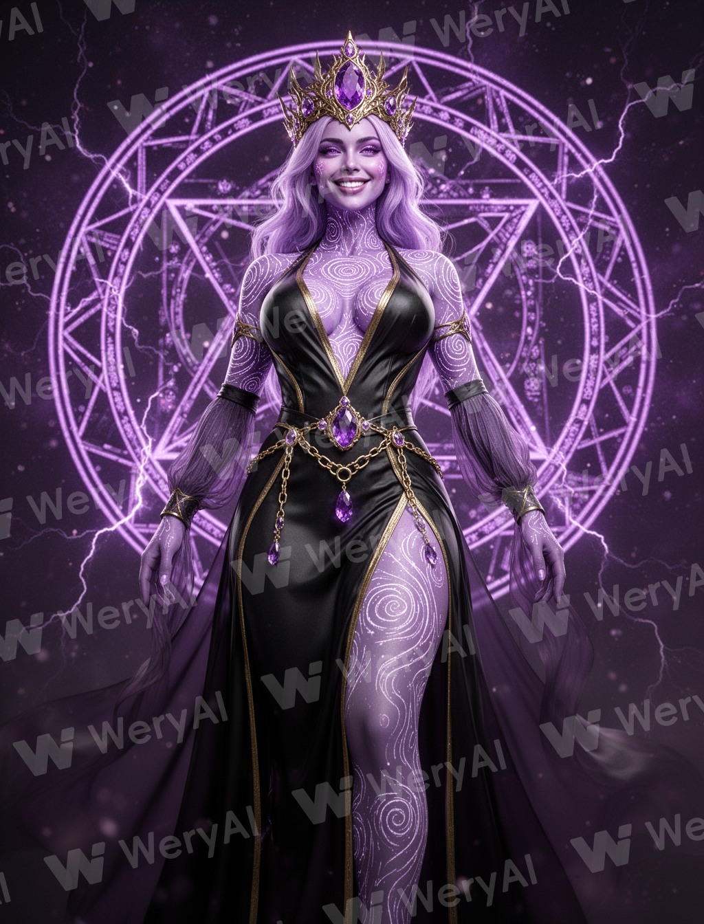 Subject: An alluring purple-skinned goddess with glowing lavender eyes and a confident smile. Her body is covered in glowing spiral tattoos, and her skin possesses high oiliness and biological luster. She has a hot physique with full breasts and hips, creating a strong visual impact. Clothing: A black satin-textured high-slit long dress with gold trim outlining the silhouette. An extreme deep V-cut showcases her full curves, while the long sleeves feature delicate silk folds and physical light refraction. Decorations: A magnificent gold crown inlaid with a giant purple gemstone, with refined gold chains and gemstone pendants hanging from her waist. Her skin patterns emit strong subsurface scattering (SSS) light effects, giving an overall sense of sacred danger. Background: Surrounded by a massive double-ring purple geometric magic circle accompanied by electric arc flickering particle effects. The deep dark purple void environment creates excellent spatial occlusion. Style: Wide-angle low-angle shot composition, where the Tyndall effect interweaves with fluid light and shadow. AO (Ambient Occlusion) is applied to enhance the sense of volume, combined with 8k Unreal Engine-level rendering and extreme edge sharpness.