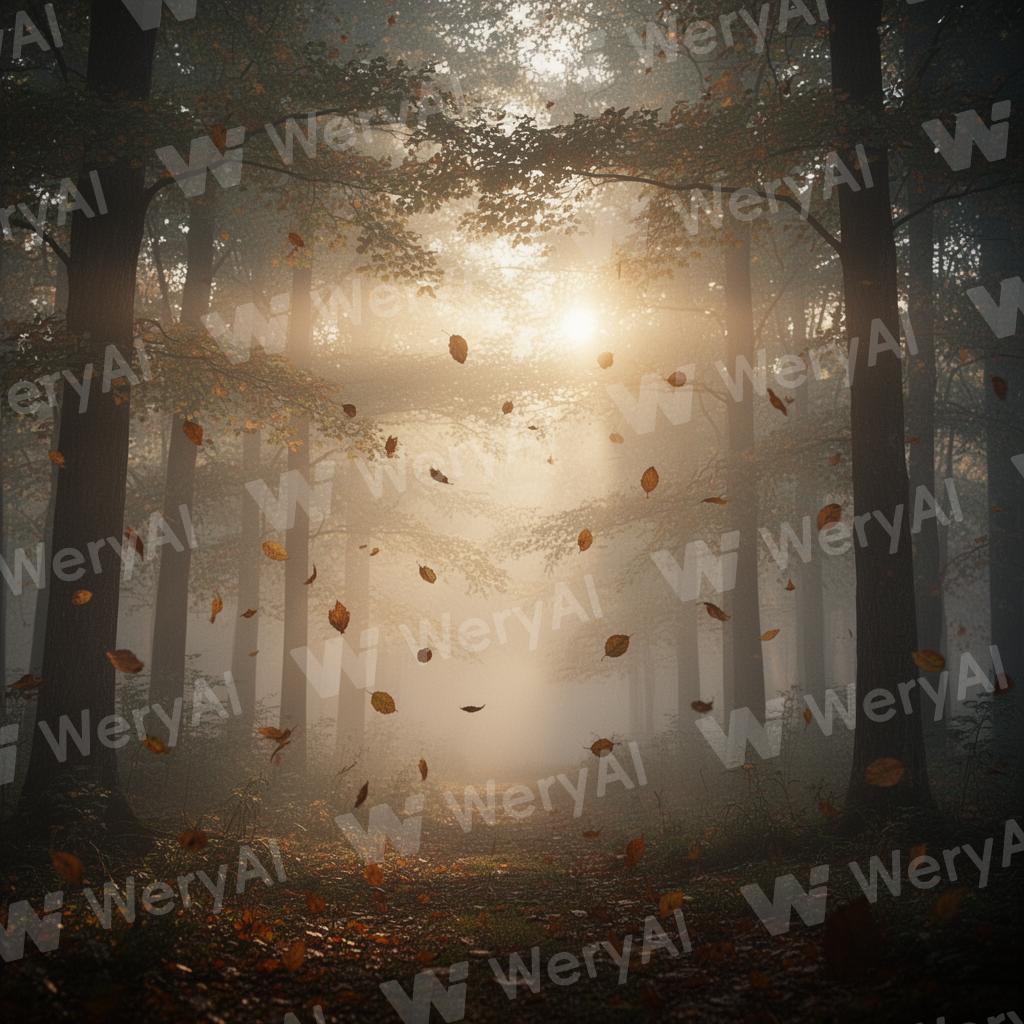 Peaceful forest at sunrise, light fog drifting between trees, soft sun rays shining through leaves, gentle falling leaves, cinematic camera pan, ultra-realistic, dreamy aesthetic, smooth loop