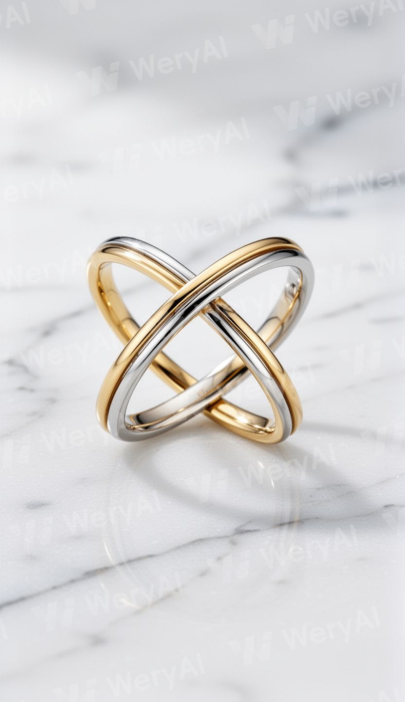 minimalist interlocking ring, K18 yellow gold and white gold bicolor, two delicate bands intersecting at precise angles, architectural geometric design, elegant kinetic frozen motion, modern timeless aesthetic, product photography, white marble surface, soft diffused lighting, high-end jewelry catalog, sharp detail, 8k --ar 1:1 --s 300 --no cute, ornate, vintage, bulky, romantic