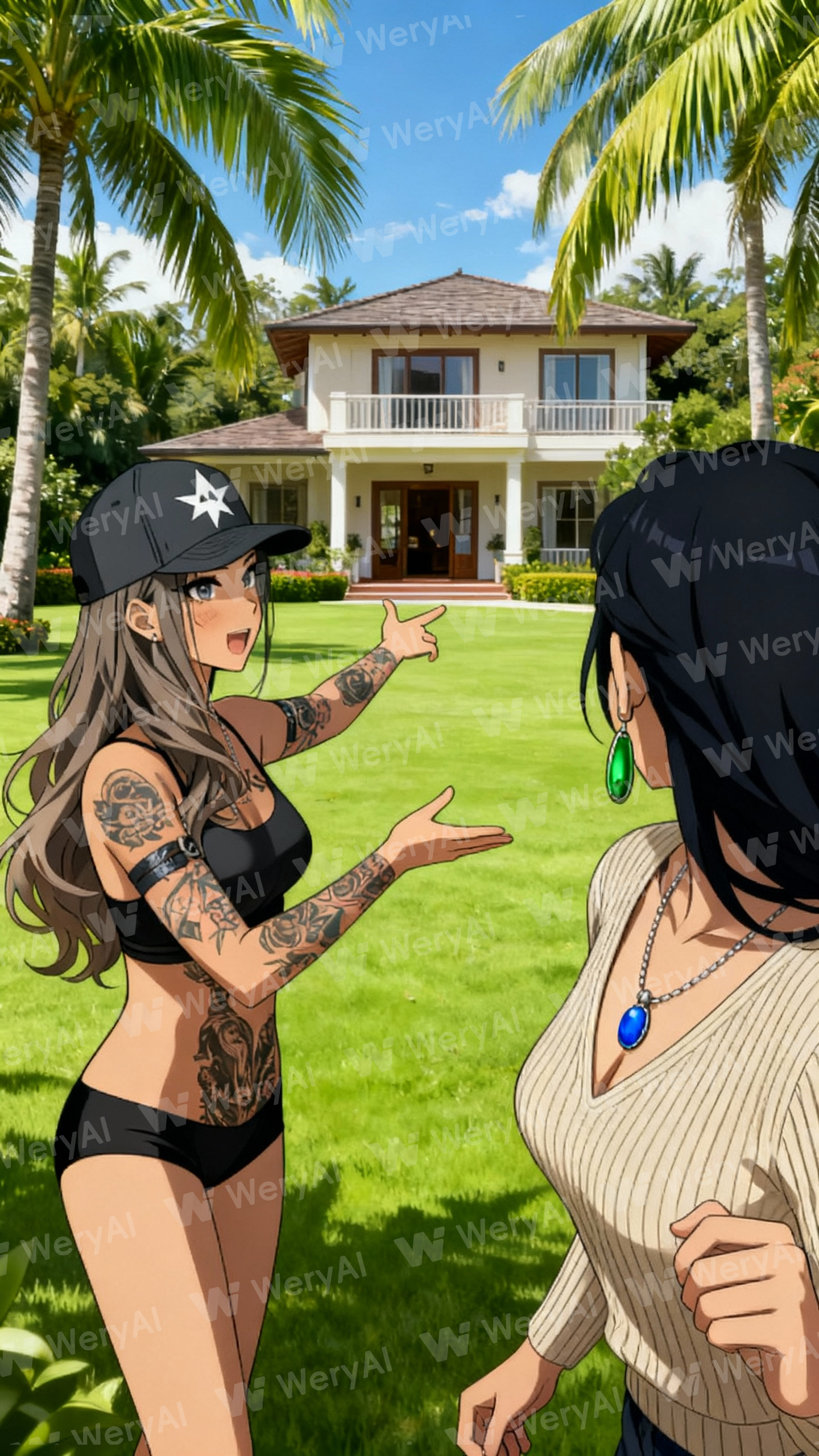 anime style, dark-haired woman, girl in a baseball cap and black bikini, wide shot, gesturing towards the guest house, manicured lawn, swaying palm trees, playful interaction between girl and woman, sense of mystery, masterpiece, best quality, ultra-detailed, cinematic quality