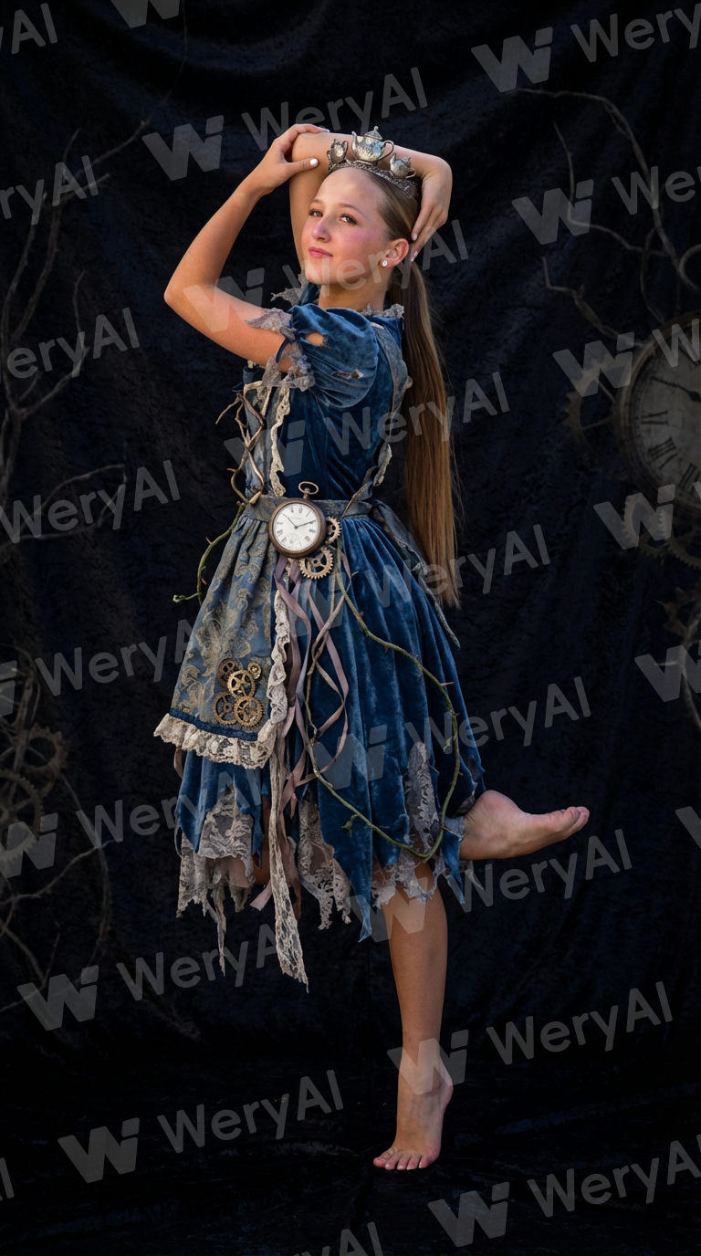 Transform this image into the same dancer but wearing a professional dance costume of Alice from Alice in Wonderland. Make the costume moody, mythic, and slightly unhinged with beauty brushing up against unease. Keep the dancer’s real human face unchanged and clearly recognizable the entire time. No face replacement, no animal head, no mask, no cartoon. The transformation is costume-only: do not replace the head. Keep the dancer in the same pose. Keep a black background with a very small amount of detail.