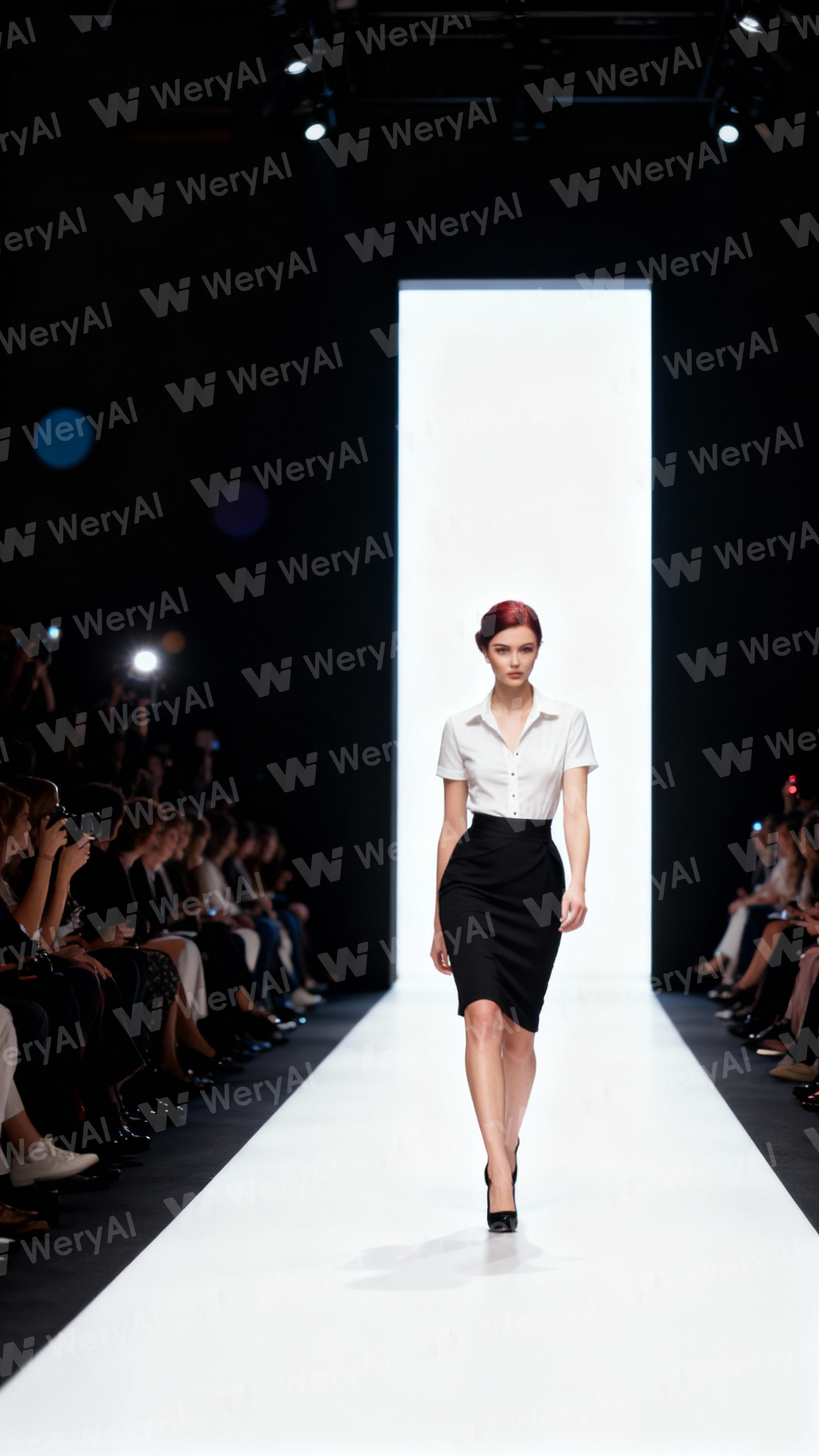 Strictly preserve the character's hair (hair color, hair style), face (mouth, nose, eyes), and clothes from the reference image. Wide-angle full-body shot, captured from the perspective of the left-side audience, diagonal composition; a white runway extending from the bottom left to the top right, an attractive model walking at the center of the runway, wearing elegant haute couture. Blurred audience seating on both sides in the dark, camera flashes and bokeh, a bright rectangular entrance in the background, cinematic lighting, 8k.