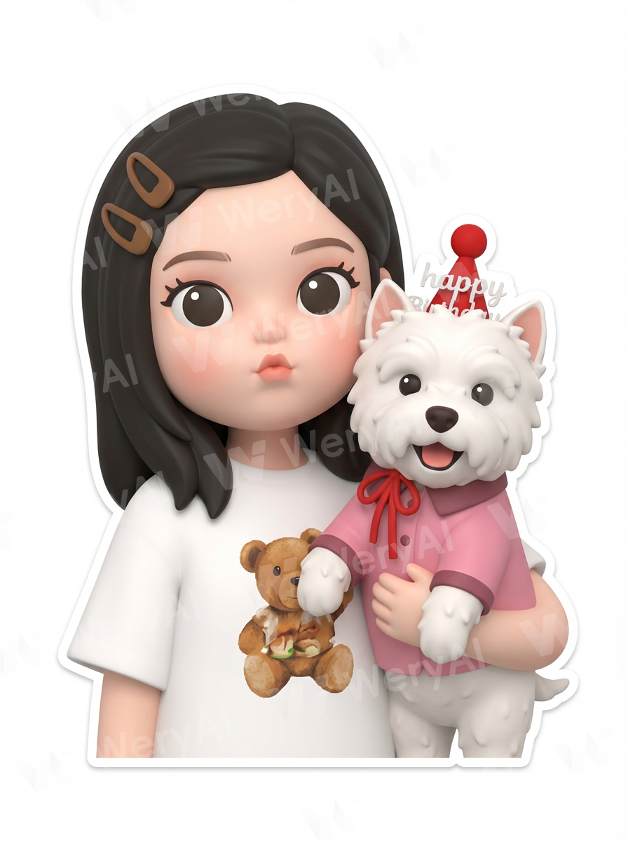 Help me generate a photo with the following requirements: Adopt the style of Pop Mart's Molly to transform the person and pet in the photo into full-body 3D sticker avatars in this style. Mimic the form, face shape, skin tone, facial features, and expressions. Keep the facial decorations, hairstyle, hair accessories, clothing, accessories, shoes, expressions, poses, and movements of the person in the photo consistent. Use a white background and ensure the final image looks like a Pop Mart Molly figure.