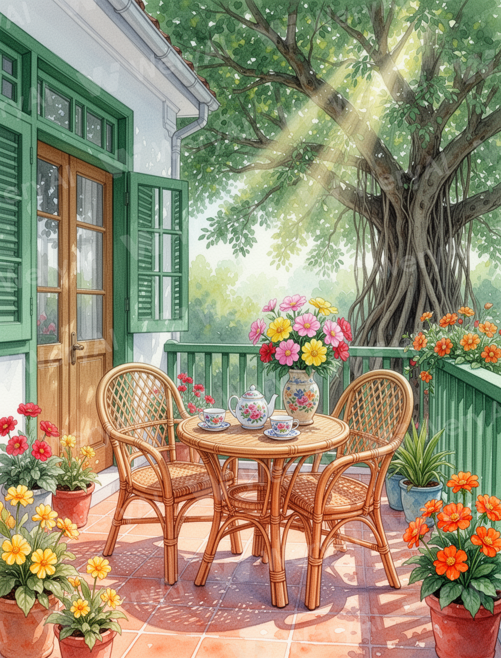 Rendered in a watercolor style, the image presents a cozy balcony scene. A house with green window frames serves as the backdrop, with wooden doors, glass windows, and a green railing adding a bright accent, while tiled flooring stretches underfoot. On the balcony stands a round rattan table with two chairs; on the table sits an exquisite patterned tea set, complete with teapot, teacups, and saucers. A ceramic vase overflows with colorful blossoms—pink, red, yellow, and orange flowers bloom all around the balcony, accompanied by several pots of lush green plants. A large, luxuriant banyan tree spreads its dense foliage like a canopy, as sunlight filters through the gaps between the leaves, casting mottled light and shadow on the ground. The bright, refreshing light brims with natural vitality, creating a soothing, realistic portrayal of everyday life on the balcony.