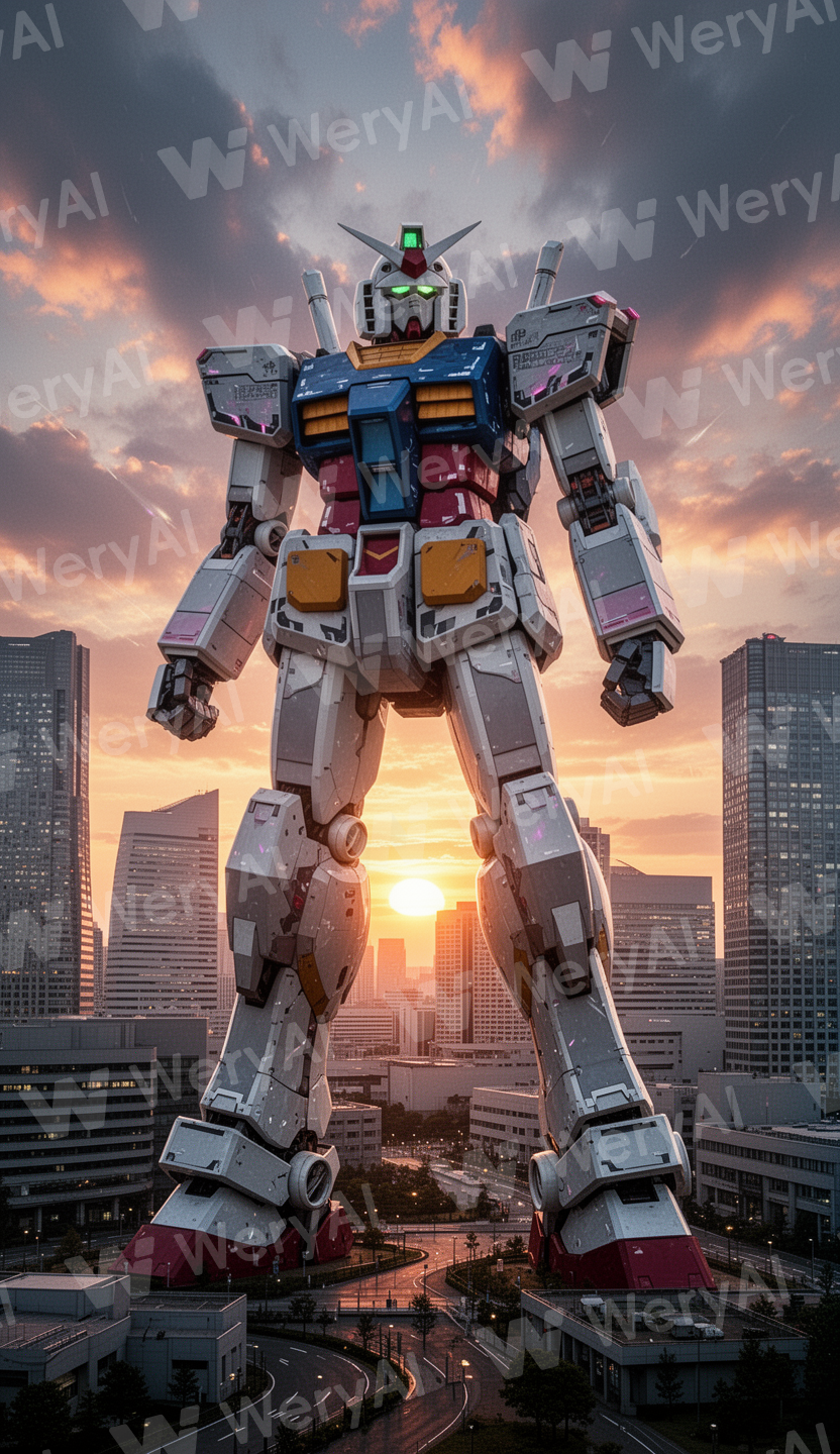 """ A Gundam-style giant robot standing tall in a futuris...