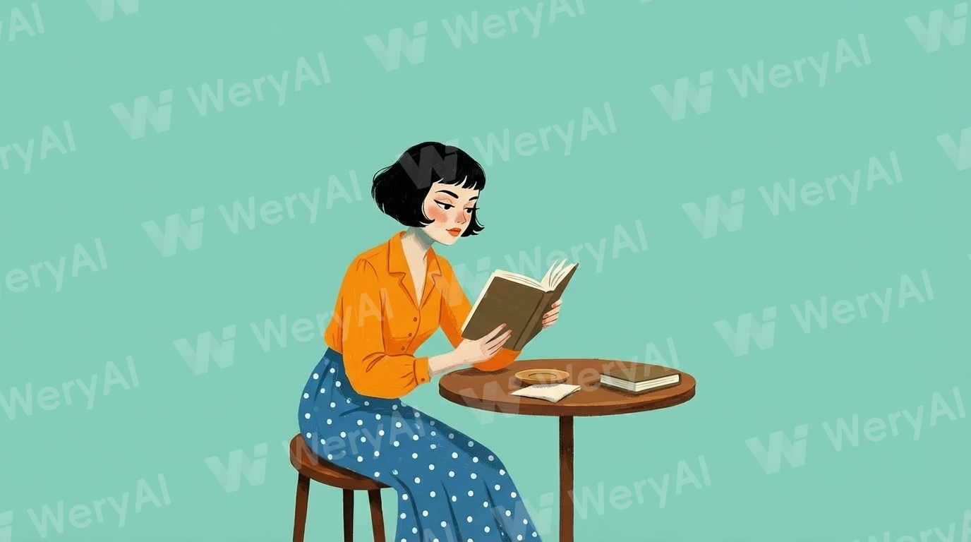 Make the character in the picture look like they are reading a book. Change the outfit, too. The top should be orange with white polka dots, and the skirt should be blue.