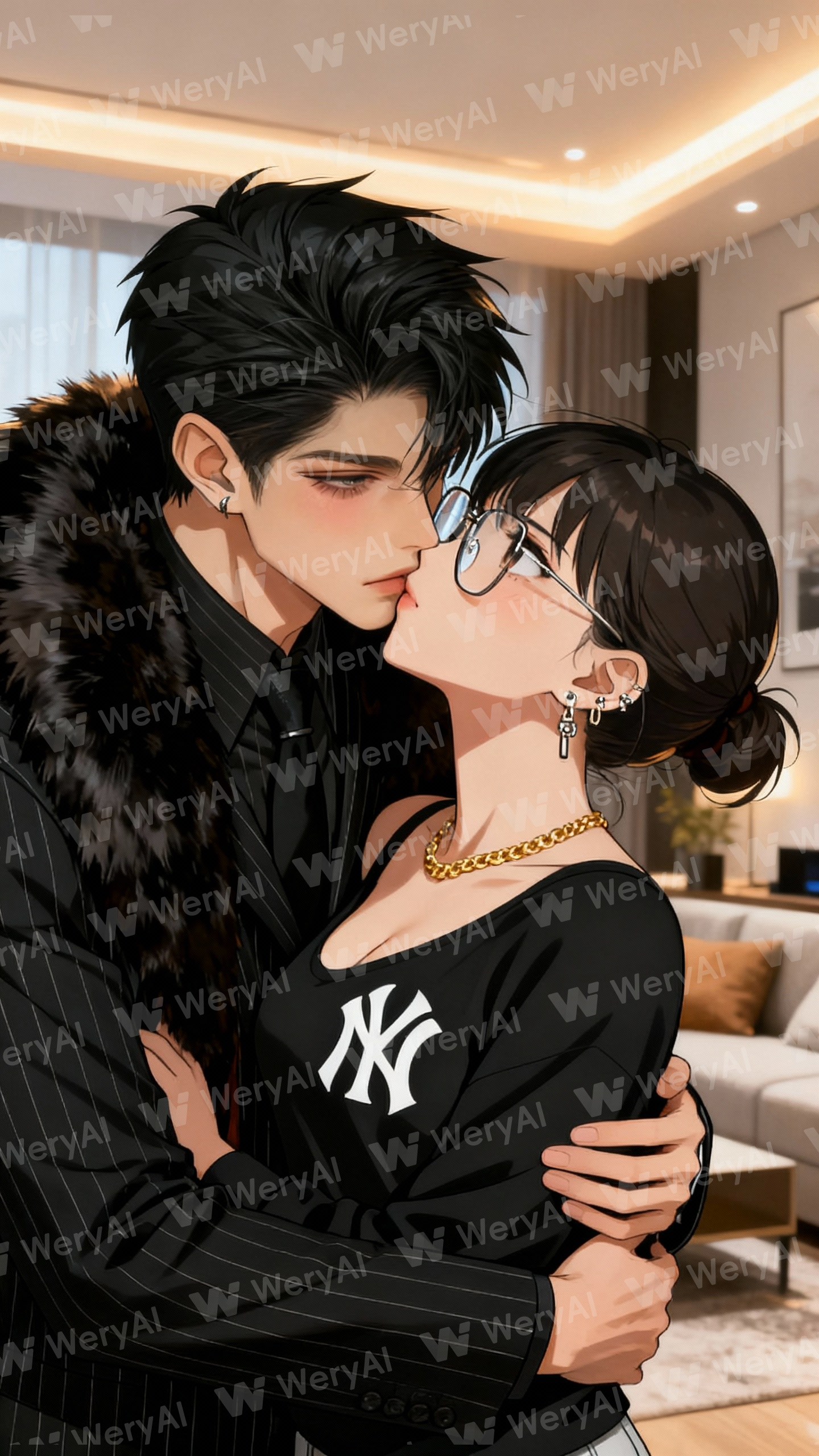 Anime style, medium shot, a man with dark hair and sharp features and a woman with glasses, embracing, sharing an intimate whisper, a slightly tsundere expression, cozy modern apartment, soft warm glow, cinematic lighting, masterpiece, best quality, ultra-detailed, cinematic quality
