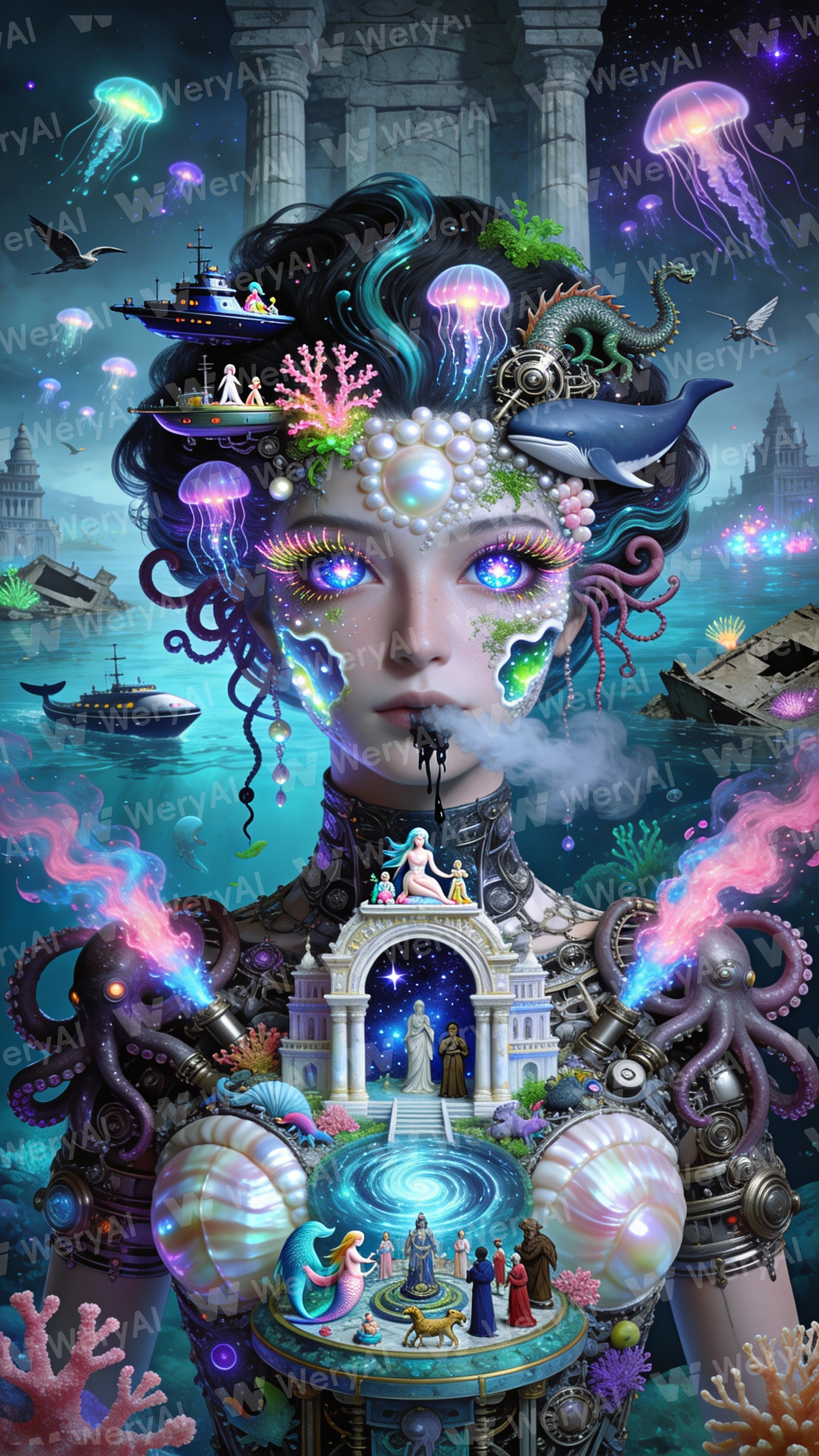 极繁超现实主义数字艺术,主体是荧光深海神话女王半身像,她的皮肤是珍珠母贝与深海机械拼接,睫毛是荧光珊瑚与机械触手,眼瞳是深海星云(里面有深海潜艇、荧光水母、微型人鱼),脸颊是珍珠溶洞与发光海藻,鼻息喷出的是深海雾气与荧光墨汁。头发是深海洋流、荧光水母、微型深海潜艇,里面藏着机械章鱼、荧光鲸鱼、深海龙,水母触须是发光的珍珠与珊瑚。身体是堆叠的深海神话宫殿、机械深海部件、荧光海洋生物,衣领是珍珠母贝宫殿拱门(上面站着微型人鱼与深海祭司),肩膀是机械章鱼触手(喷出粉蓝交织的荧光墨汁),胸口是深海祭坛,上面是微型深海祭祀人群(人鱼、神兽、祭司),祭坛中央是旋转的深海漩涡微缩模型。背景是荧光深海深渊,漂浮着宫殿残骸、深海潜艇、荧光海洋生物群,天空(深海)飘着荧光水母群、机械飞鸟、发光珊瑚,远处是深海神殿的巨型石柱。配色以深海蓝、荧光粉、珍珠白、墨黑为主,点缀海藻绿与星尘紫,氛围神秘迷幻、深海神话奇幻感。