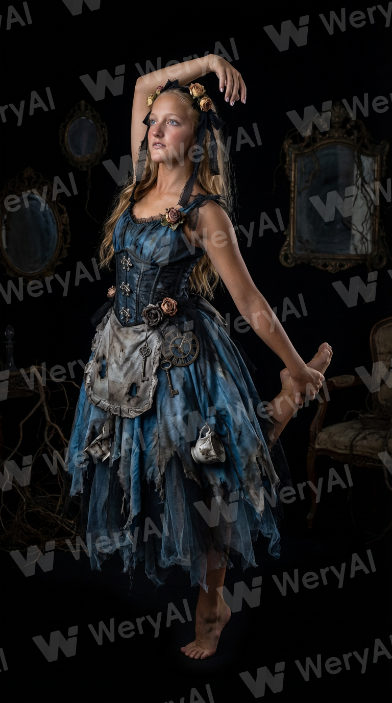 Transform this image into the same dancer but wearing an Alice in Wonderland professional dance costume. Make the costume moody, mythic, and slightly unhinged with beauty brushing up against unease. The Vibe should be Dark whimsical fantasy with a time-worn Wonderland aesthetic. The image feels ethereal, slightly eerie, and poetic, blending elegance with decay. It has a storybook-gone-dark mood—beautiful but unsettling, refined yet unraveling. Keep the dancer’s real human face unchanged and clearly recognizable the entire time. No face replacement, no animal head, no mask, no cartoon. The transformation is costume-only: do not replace the head. Keep the dancer in this exact dance pose. Keep a black background with a very small amount of detail.