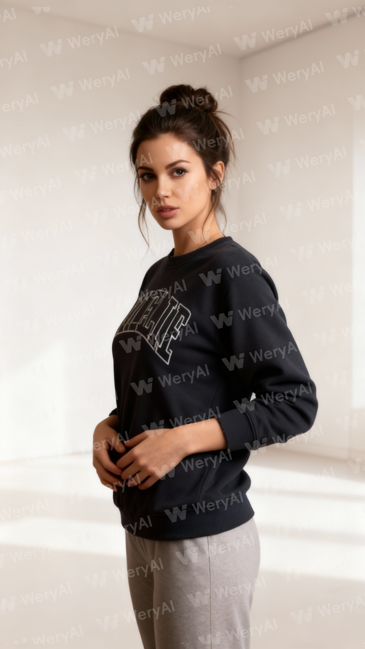 [Hair] Keep the hairstyle and hair color from the character; do not change style, length, or color. [Clothes] Preserve the character's clothes. [Pose & Hands] Slightly angled 3/4 view facing the camera in a relaxed full-body pose. Both hands rest gently on the character's lower abdomen. [Camera] Fixed waist-level height, straight-on angle, framing centered on hips and waist with slight headroom. [Environment & Lighting] **Completely empty room**, Minimalist modern indoor room, off-white walls, soft daylight. Subtle shadows, Symmetrical soft lighting, shallow depth of field. Remains simple, uncluttered, blank. [Face] Perfect balanced features, flawless smooth skin, clean fine pores, refined nose and lips, natural soft expression. [Eyes & Skin] Eyes: natural dark irises, pure-black pupils, no glow. Skin: healthy, natural tone consistent with the reference image, no over-smoothing. [Quality & Style] Masterpiece, best quality, ultra-realistic, 8k UHD, photorealistic live-action.