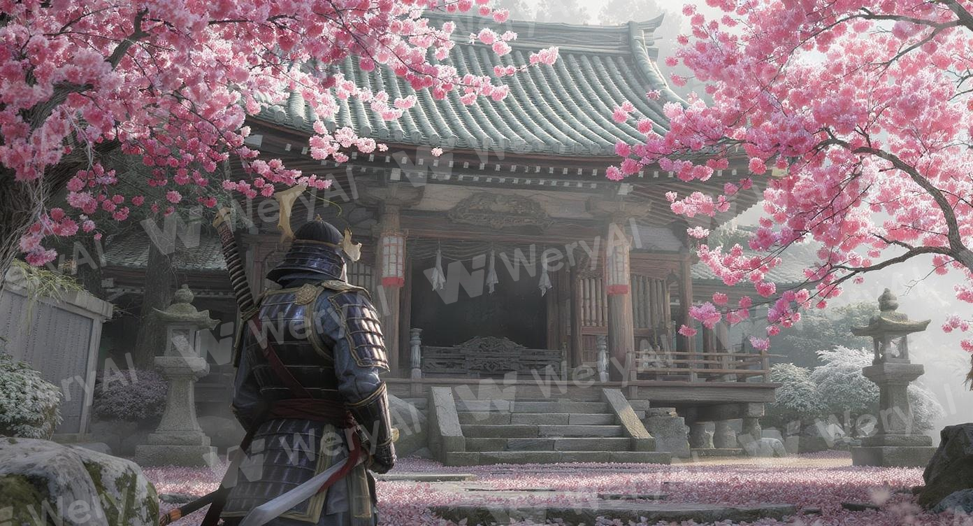 A 3D animation scene. In the distance, a Japanese samurai dressed in exquisite traditional bushido attire stands with their back to the camera in front of an ancient wooden Shinto shrine. Further away, blooming pink cherry blossom trees are rendered in clear detail, and stone lanterns stand silently.