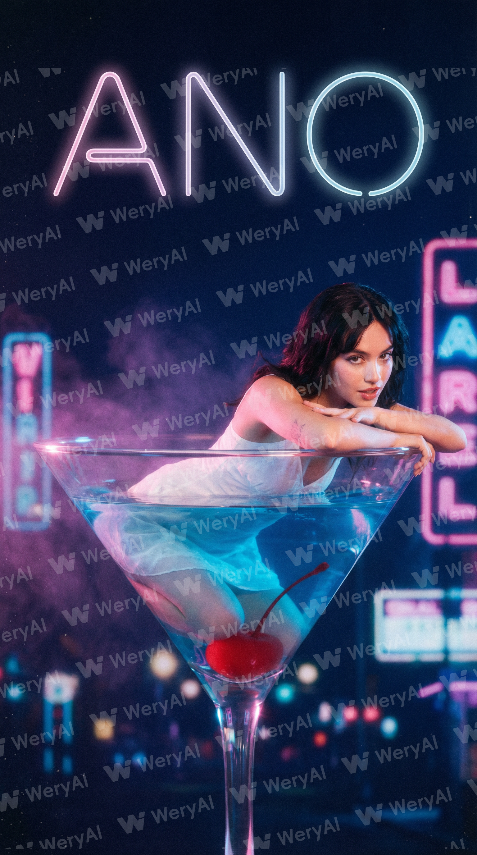 アーティストの「あの」さんのポスターを作ります。 ・大きなカクテルグラスにブルーのカクテルとチェリー ・その中に白いワンピースを着たあのさんが入っている ・カクテルグラスの縁に腕をのせてこちらをみている ・背景は紺でネオンのような光 ・ANOと細い書体で大きく入っている ・petrafcollinsのようなライティング、トーン以下参考↓ https://www.instagram.com/petrafcollins/