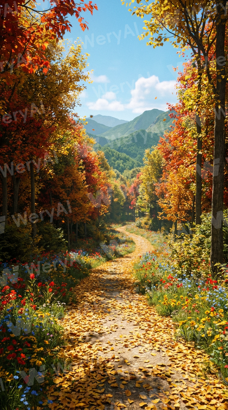 An autumn mountain path, the ground covered with golden fallen leaves. On both sides are colorful wildflowers and lush trees. Sunlight filters through the gaps in the branches, casting dappled light. The path winds and extends into the distance. In the distance are layered green mountains and a clear blue sky. A few wisps of white clouds float leisurely. A gentle breeze blows, and the leaves sway softly. The overall image is fresh and healing, with bright and soft tones, filled with an atmosphere of moving forward leisurely. No people. Suitable for daily quote wallpapers. High resolution, balanced composition.