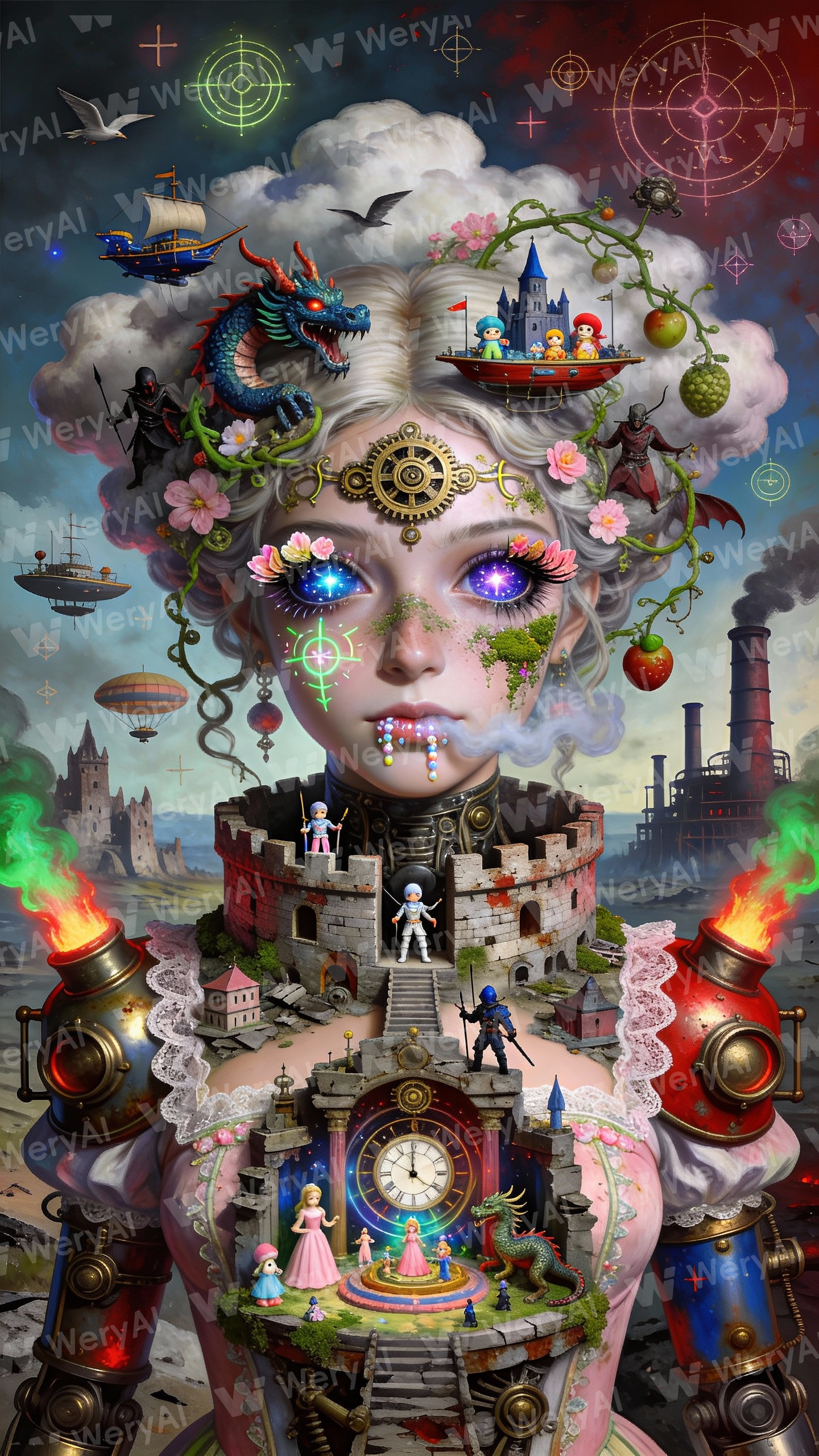 极繁超现实主义油画,主体是蒸汽童话末日公主半身像,她的皮肤是蒸汽金属与童话蕾丝拼接,睫毛是蒸汽齿轮与童话花瓣,眼瞳是蒸汽星云(里面有蒸汽飞船、童话城堡、微型童话角色),脸颊是蒸汽苔藓与发光符文,嘴角挂着蒸汽雾气与童话糖霜。头发是蒸汽云、童话藤蔓、微型蒸汽飞船,里面藏着蒸汽恶龙、童话骑士、末日部落民,藤蔓上结着蒸汽果实与童话花朵。身体是堆叠的蒸汽童话城堡废墟、机械蒸汽部件、末日部落建筑,衣领是蒸汽城堡城墙(上面站着微型童话骑士与末日战士),肩膀是蒸汽锅炉(喷出红绿交织的蒸汽焰),胸口是童话祭坛,上面是微型末日童话仪式(公主、骑士、恶龙、部落民),祭坛中央是旋转的蒸汽时钟微缩模型。背景是蒸汽末日荒原,漂浮着城堡废墟、蒸汽飞船、末日浮空艇,天空飘着蒸汽云、机械飞鸟、发光符文,远处是蒸汽堡垒的巨型烟囱。配色以锈红、钴蓝、荧光绿、古铜为主,点缀童话粉与末日灰,氛围复古荒诞、蒸汽童话末世感。
