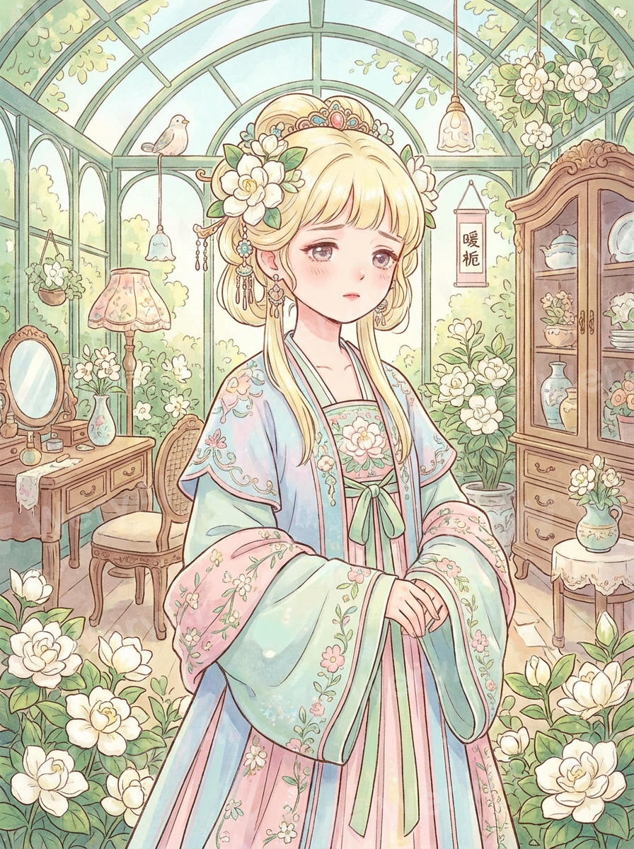 Draw a random illustration in a high-quality art style: Warm Gardenia. The character's accessories, clothing, and the surrounding scenery feature rich and intricate details. Macaron color palette, simple and rounded, cute art style, beautiful colors, atmospheric, with a hint of light melancholy.