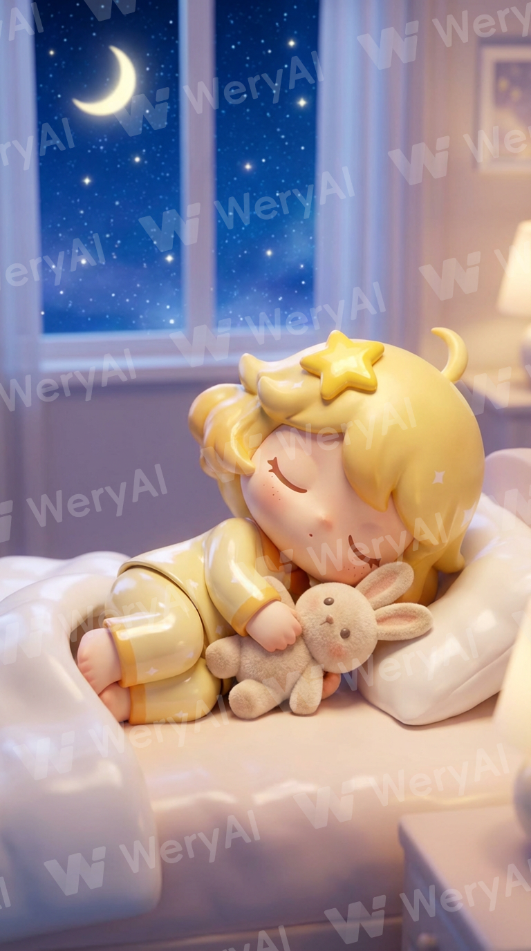 Pop Mart style, character in a casual sleeping posture, blanket kicked off, hugging a rabbit plushie. Simple modeling, delicate and smooth PVC texture, starry sky outside the window. Quiet night, healing and childlike charm, Octane Render, 9:16.
