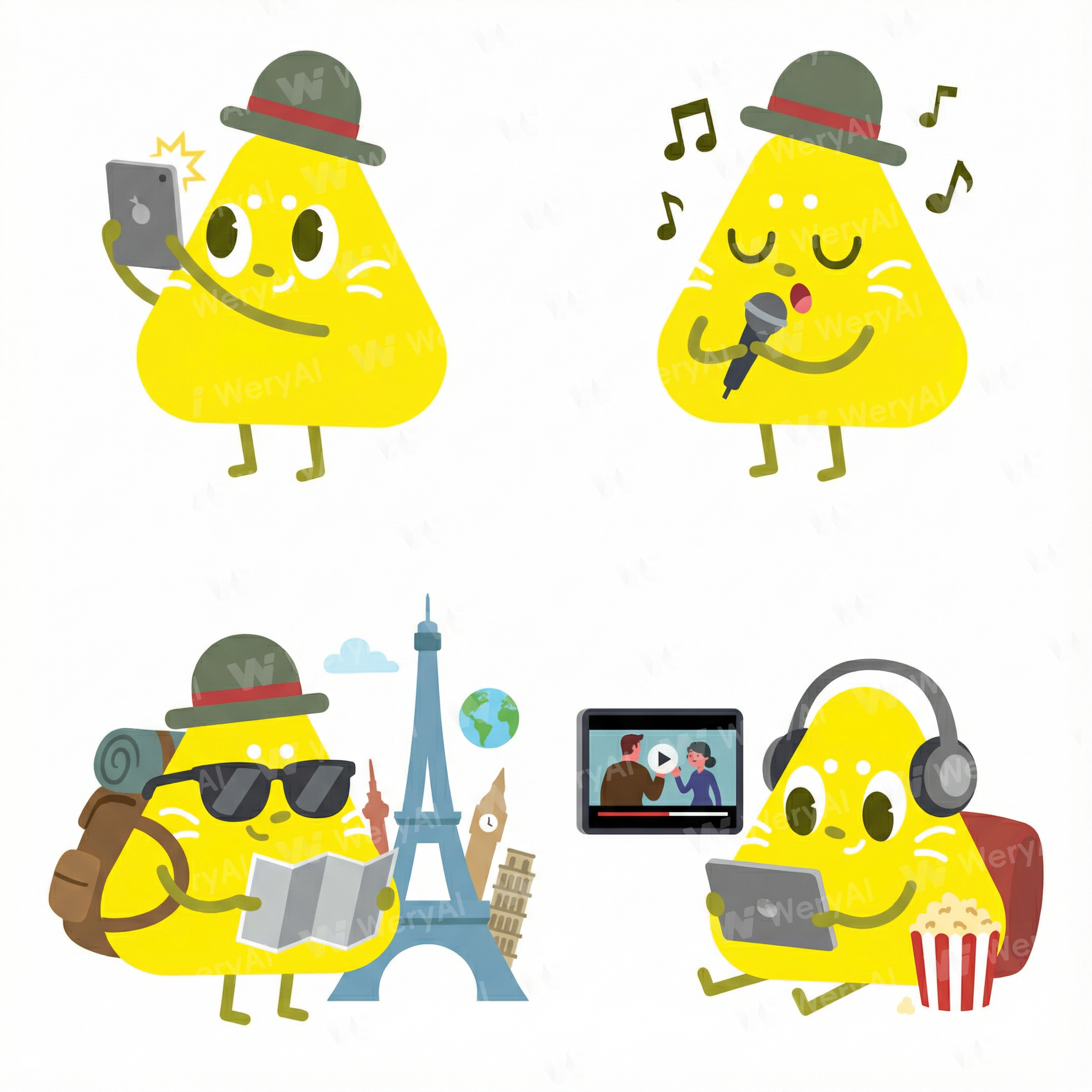白色背景,2d风格,矢量化,不改变原素材生几个形象动作,在拍照,在唱歌,在旅游,在看剧