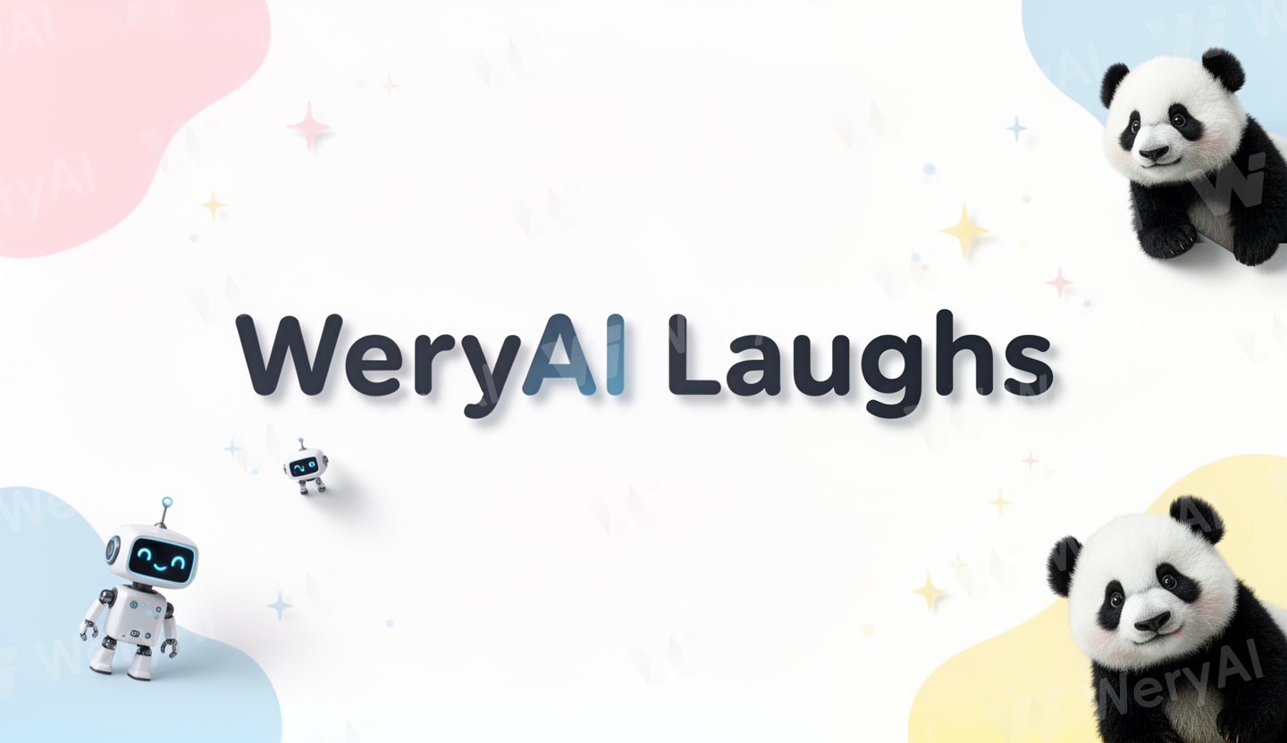 Minimalist digital banner with a clean white background and soft pastel accents (light pink, baby blue, soft yellow). Centered playful text: 'WeryAI Laughs' in modern rounded font. Include small cute AI-generated elements: a tiny smiling robot, a baby panda peeking from a corner, and subtle floating sparkles. Style: neat, bright, clean, friendly, appealing for YouTube and Instagram. Balanced composition, not cluttered, soft shadows for depth, high-resolution.