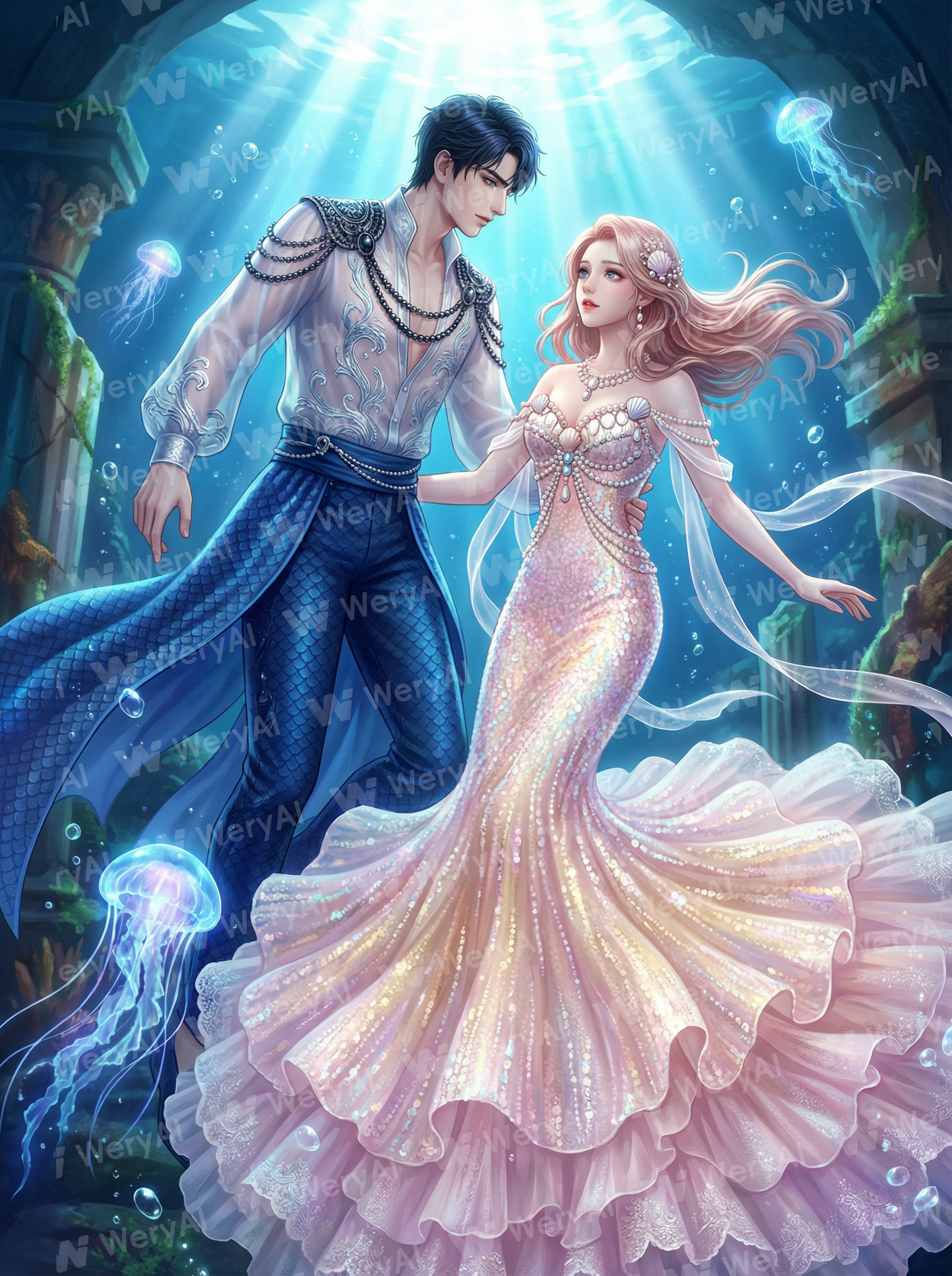 Female Lead (Mermaid Princess persona): She wears a stunning pearlescent gradient mermaid gown. The dress is covered with thousands of hand-sewn iridescent sequins and Swarovski crystals, simulating a gradient scale effect from pale pink to gold that shimmers under the light. The massive skirt is the design's focal point, composed of countless stacked layers of ultra-light tulle, lace, and silk. When spread in the water, its diameter exceeds two meters, resembling a giant flower blooming in the deep sea. Her upper body is a corset embellished with pearls, shells, and gemstones, with several flowing transparent ribbons wrapped around her arms.