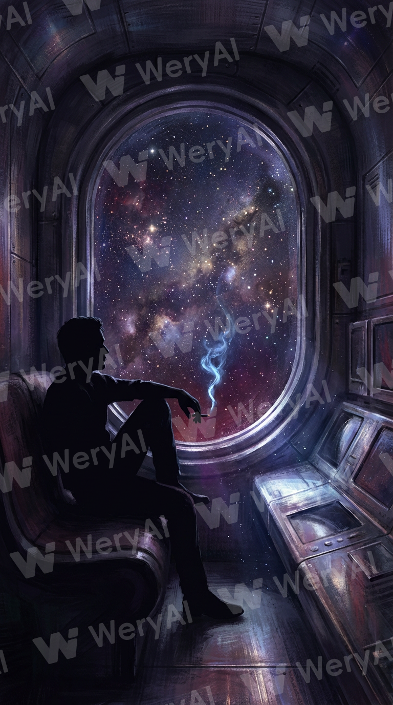 Cinematic fantasy illustration with a rich, painterly, epic fine-art style, highly detailed and atmospheric, inspired by dramatic surreal nightscapes and textured brushwork. Inside a dark spaceship interior, an adult man sits on a curved bench-like seat in front of a large sideways oval window. He is shown only as a full silhouette, side profile visible, seated sideways with one knee raised, posture relaxed and contemplative. No facial features are visible. A lit cigarette rests between his fingers, emitting a thin, subtle trail of smoke that softly catches the light. Outside the window stretches a vast, realistic deep-space galaxy resembling astrophotography: a dense star field with countless tiny stars, deep purples and blues, subtle whites, and natural cosmic variation rather than stylized shapes. Small yellow-white stars glow gently, restrained and natural, not exaggerated. The galaxy feels immense, quiet, and infinite. The spaceship interior remains mostly in shadow, with faint, realistic metallic details, soft reflections, and minimal controls barely visible. Dim cosmic light spills into the cabin, creating cinematic contrast and depth. The overall tone is moody, introspective, and serene. Painterly realism, textured brush strokes, dramatic lighting, surreal yet grounded sci-fi fantasy aesthetic, high detail, not cartoonish, not stylized, not animated.