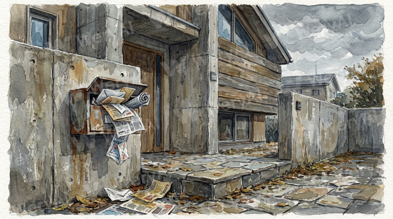 (thick watercolor painting style:1.3), impasto brushstrokes, visible texture, muted and slightly somber colors. The entrance porch of a modern Japanese residence, simple and gender-neutral exterior design (e.g., combination of concrete and plain wood). A wall-mounted mailbox next to the front door is completely stuffed and overflowing with letters, flyers, and newspapers, some spilling onto the ground. The area looks neglected and long deserted. No people, cloudy sky, quiet and unsettling atmosphere.