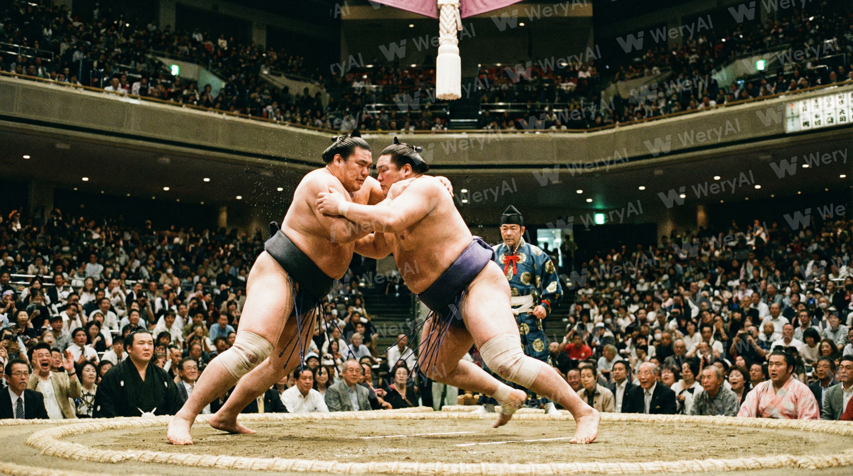 Two Japanese sumo wrestlers. Competing in an arena. Sports photography.