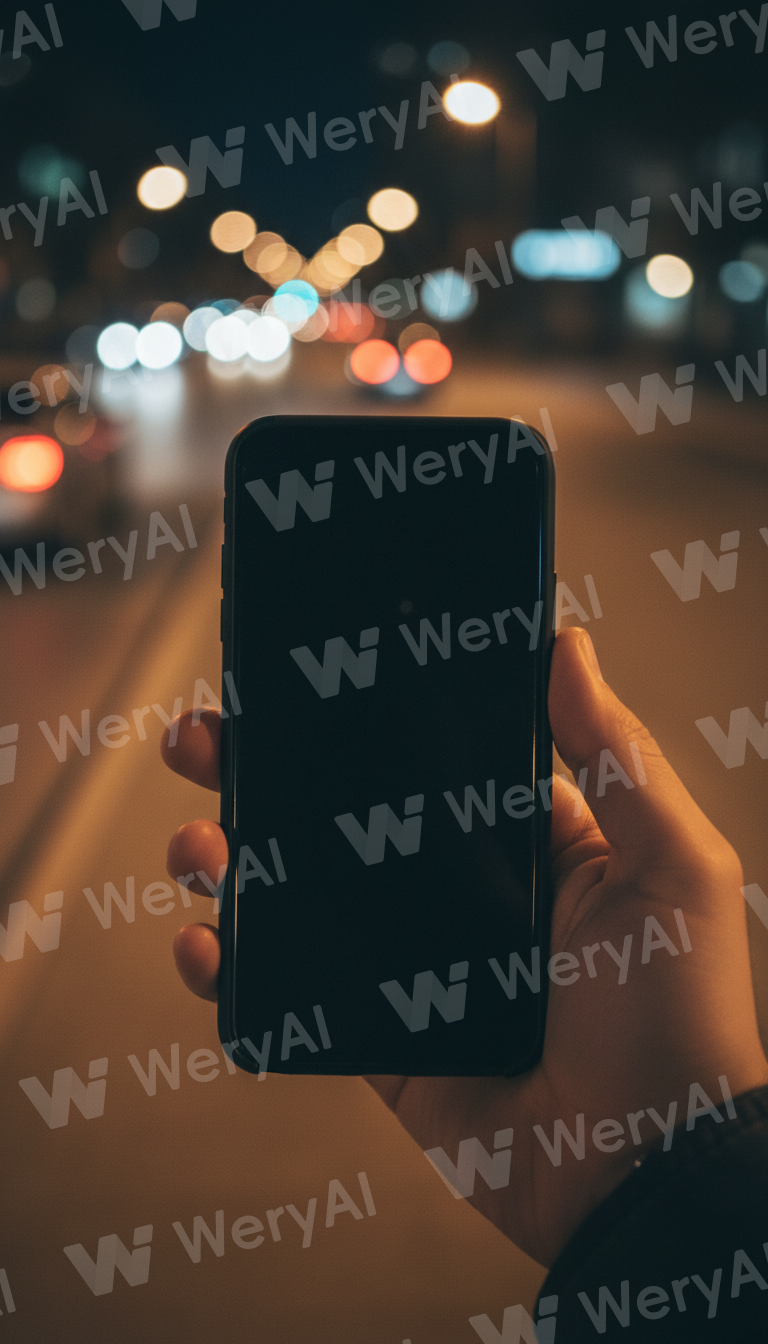 A first-person perspective (POV) looking at a smartphone outdoors. The moment right after a call has ended and the phone was hung up. The smartphone is held in hand, but the screen is completely black with nothing displayed. No call history, text, icons, or notifications. There is a lingering afterglow of the call, a stillness as if the hand has paused for a moment. The surroundings are outdoors at night, with streetlights, distant car lights, and a soft background bokeh. The black screen of the phone slightly reflects the surrounding light, but neither the face nor the scenery is discernible. Although it is a POV shot, the face, body, or shadow are not reflected. A momentary void in daily life. Realistic, natural light, cinematic, a quiet atmosphere with a lingering emotional resonance. High resolution, for social media.