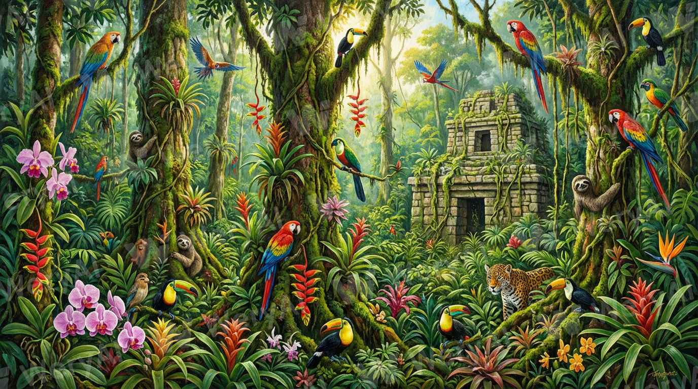 Draw a picture of the heart of the beautiful, lush Peruvian jungle.