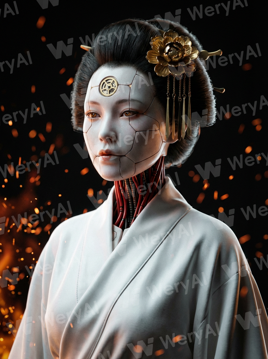 Subject: Bionic mechanical geisha, porcelain prosthetic face with precise assembly seams, pale amber shimmering irises, red high-density mechanical bundle neck. Attire: Pure white minimalist silk outer robe showing a low-reflection luster, clear draped folds on the shoulders, and distinct edge textures. Decoration: Heavy metal craft gold peony hairpin with swaying metal pendants, a micro brass linkage gear embedded in the center of the forehead. Background: Boundless dark void, scattered with dynamic spark particles creating a strong bokeh effect, with intense depth of light and shadow. Style: Cinematic macro, utilizing high-precision sub-surface scattering (SSS) to capture the porcelain shell texture, emphasizing ambient occlusion (AO) shadows.