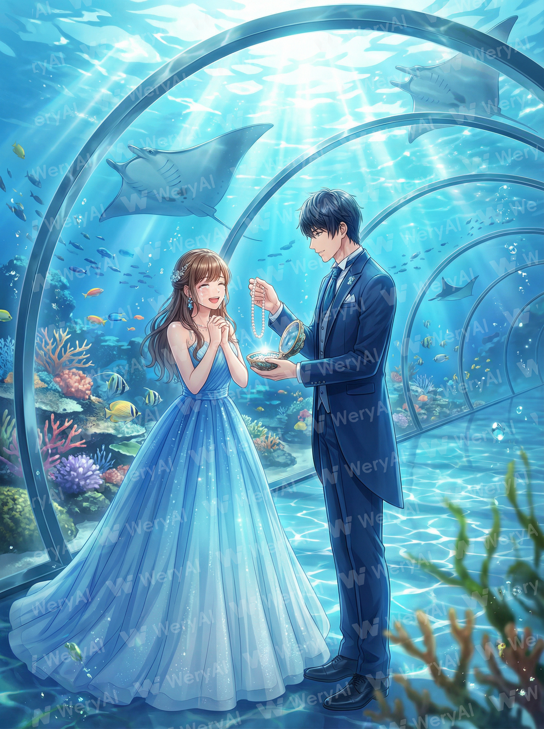 Otome game CG illustration, exquisitely aesthetic, inside a massive underwater glass tunnel. Sunlight filtering through the seawater casts dynamic caustics. A couple; the male lead, wearing an elegant deep-sea blue formal suit, is presenting a glowing pearl necklace from a seashell box to the female lead. The female lead wears a water-blue gradient tulle dress, her expression filled with joy and emotion. Outside the glass are vibrant coral reefs, schools of fish, and a giant manta ray. Dreamy atmosphere, transparency, high detail, intricate clothing details, character close-up, facial expression close-up. 8k resolution. Subtle hints of green and brown in the palette.